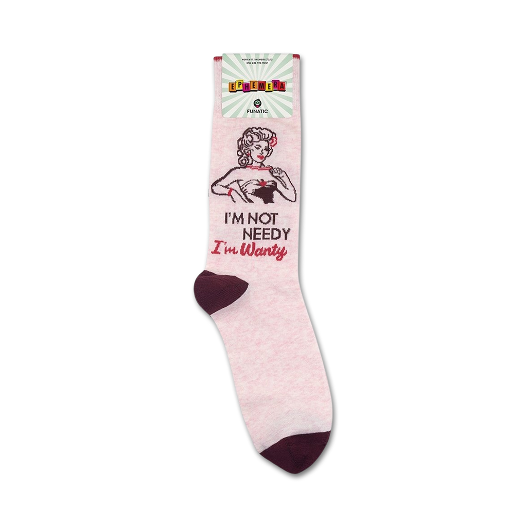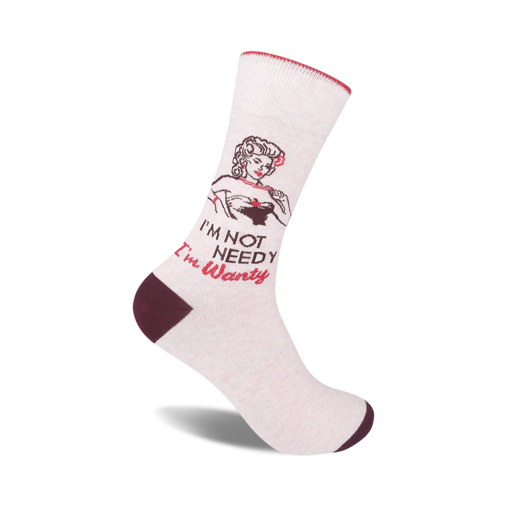 These 'I'm Not Needy I'm Wanty' novelty socks scream fun and cheekiness. Imagine slipping into these comfy crew socks with a smiling bikini-clad woman on them. These socks are not just a foot covering but a statement piece, a conversation starter guaranteed to bring smiles. They say it all: sassy, independent, and not afraid to own it!
