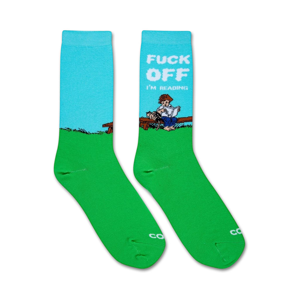 Grab a pair of these 'I'm Reading' book-loving socks and put your feet up with a good book! These green and blue socks are covered in the words 'F--k off...I'm Reading' and feature a person engrossed in a book. So next time someone tries to bother you while you're lost in a great book, just show them your socks and they'll get the message!