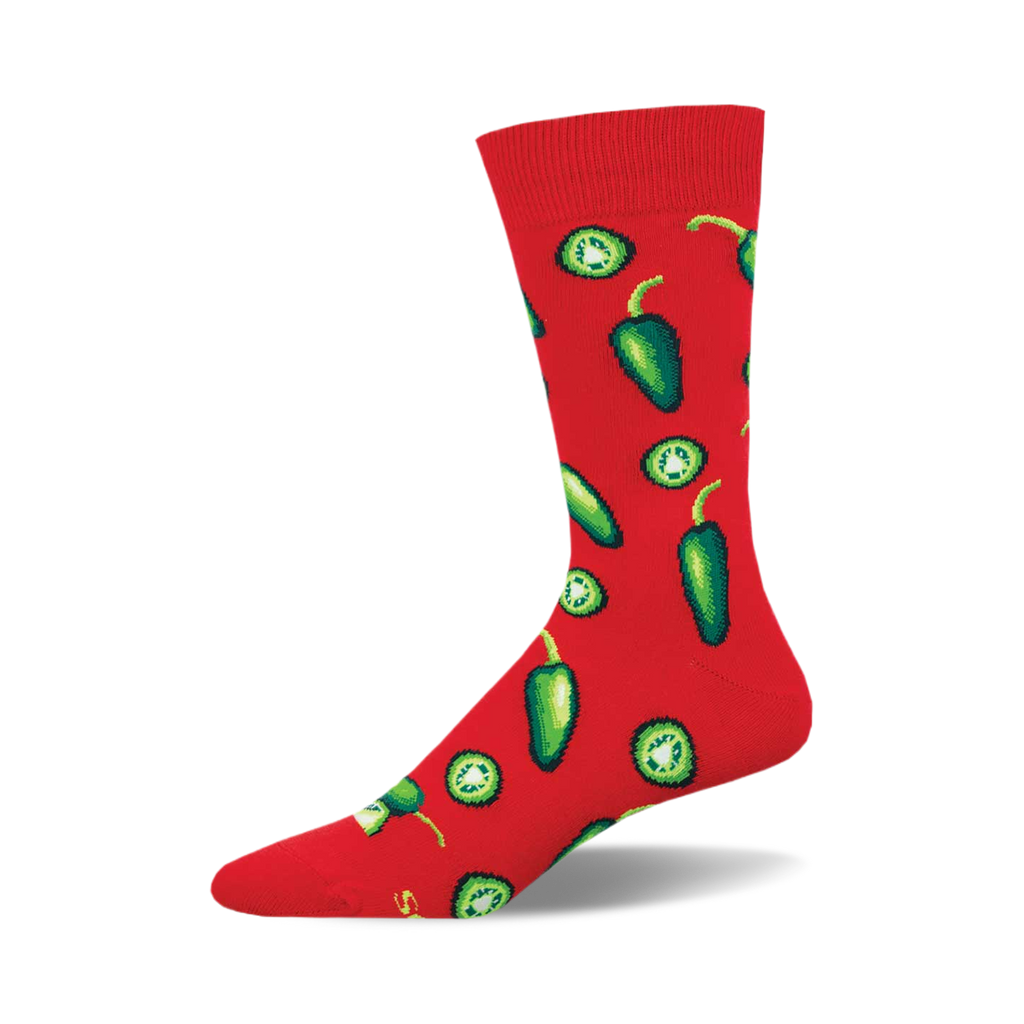 Light up your sock drawer with our Jalapeno Business socks! Who knew fiery peppers could look so cool on your feet? Ideal for spicing up office attire or adding a splash of fun to casual hangouts, these red crew socks with zesty green jalapeno patterns are sure to ignite your wardrobe and heat up any outfit. Perfect for those who like to add a little kick to their step - why keep your fiery personality hidden? Slip on a pair and let the world know that you're all about that jalapeno business!