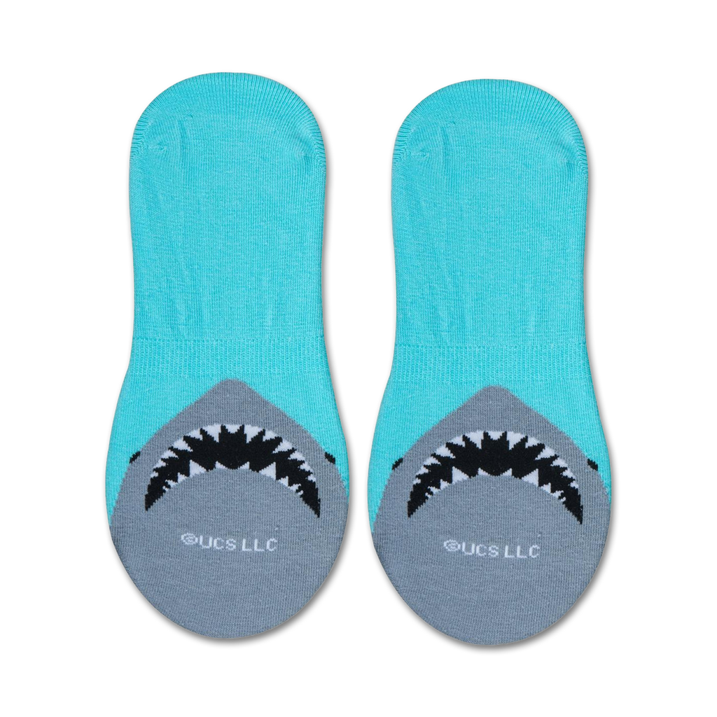 Jaws socks: the perfect way to add a touch of fun and style to your everyday look. These liner socks feature the iconic Jaws logo in bright red, with the word "cool" embroidered below. The gray toes and heels add a touch of sophistication, while the blue fabric keeps your feet comfortable all day long. Whether you're a fan of the classic film or just love sharks, these socks are sure to make a statement.