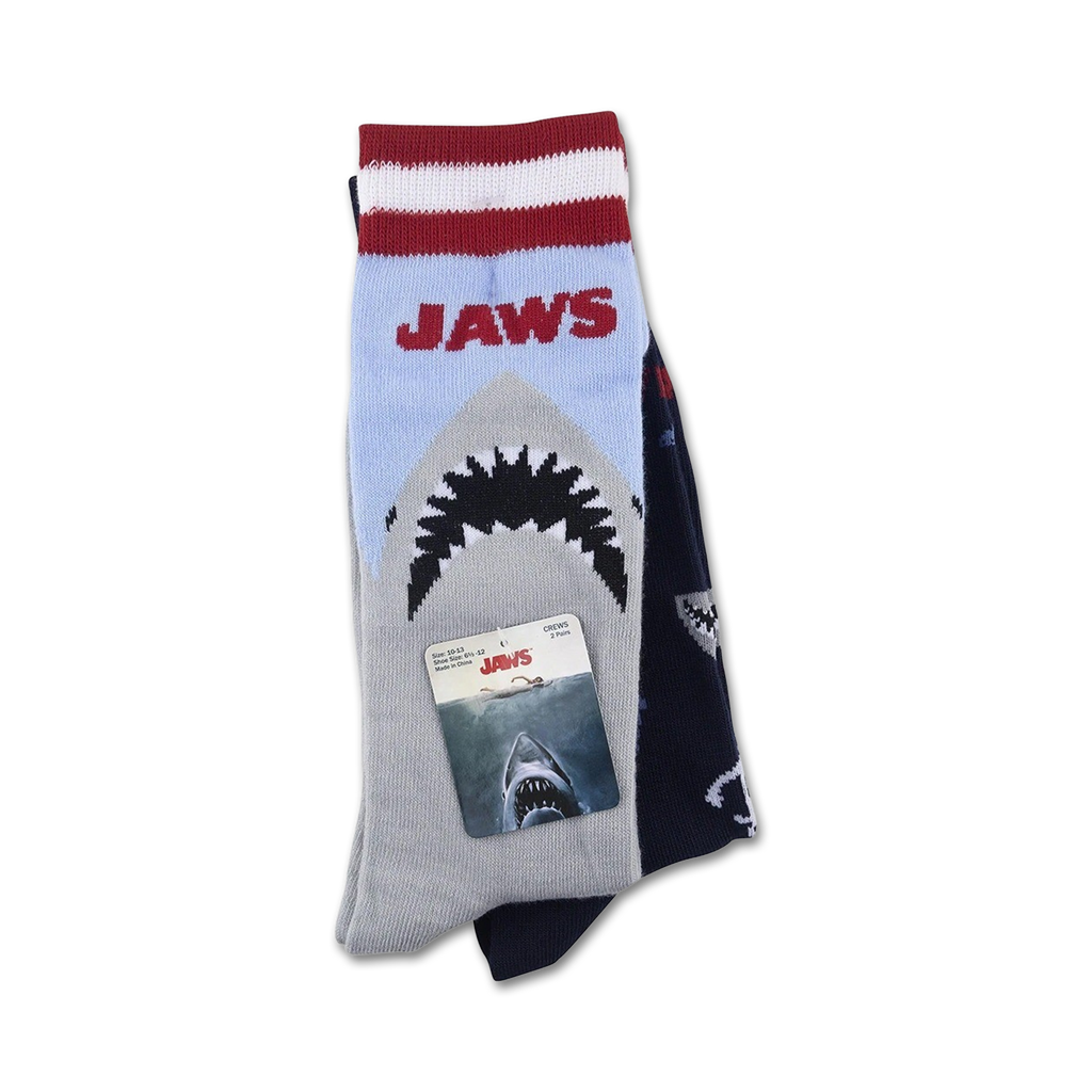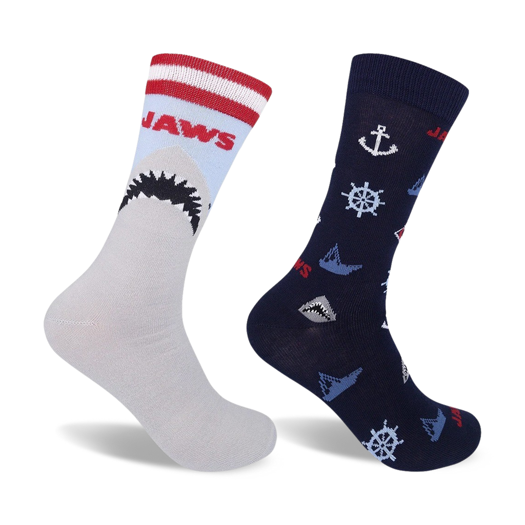 Jaw-some socks for fans of the classic horror film Jaws! One sock features a bold print of the iconic shark with splashes of blood and the other features a salty blue seascape filled with anchors and ship wheels. Slip into a pair of these crew-length socks and take a bite out of boredom! Fun Fact: In the movie Jaws, the mechanical shark was named Bruce.