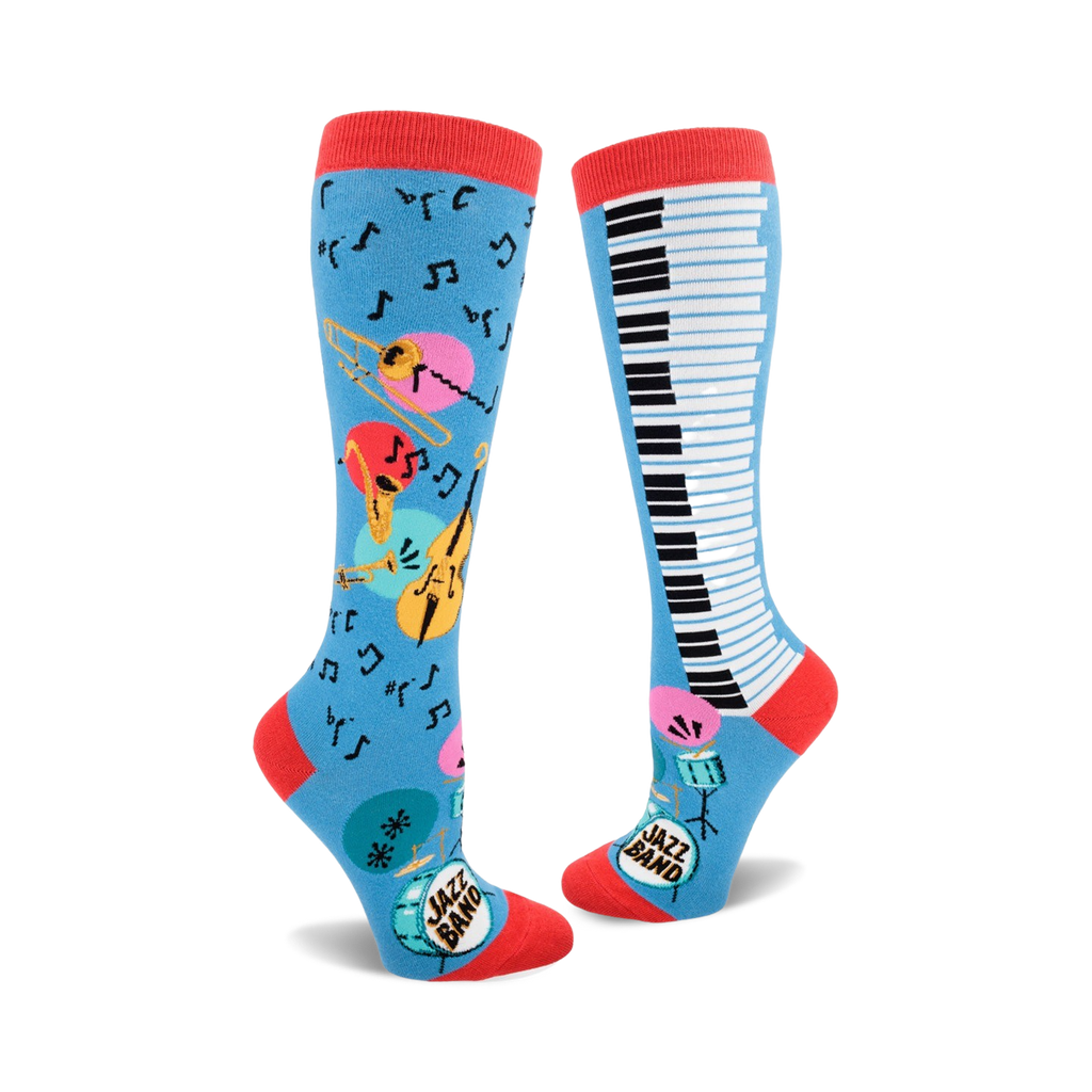 Jazz up your wardrobe with these knee-high socks for women, featuring a lively pattern of musical instruments and musical notes in blue, highlighted with red accents at the top and bottom. Perfect for any jazz enthusiast or music lover, these socks will add a touch of rhythm to your day.