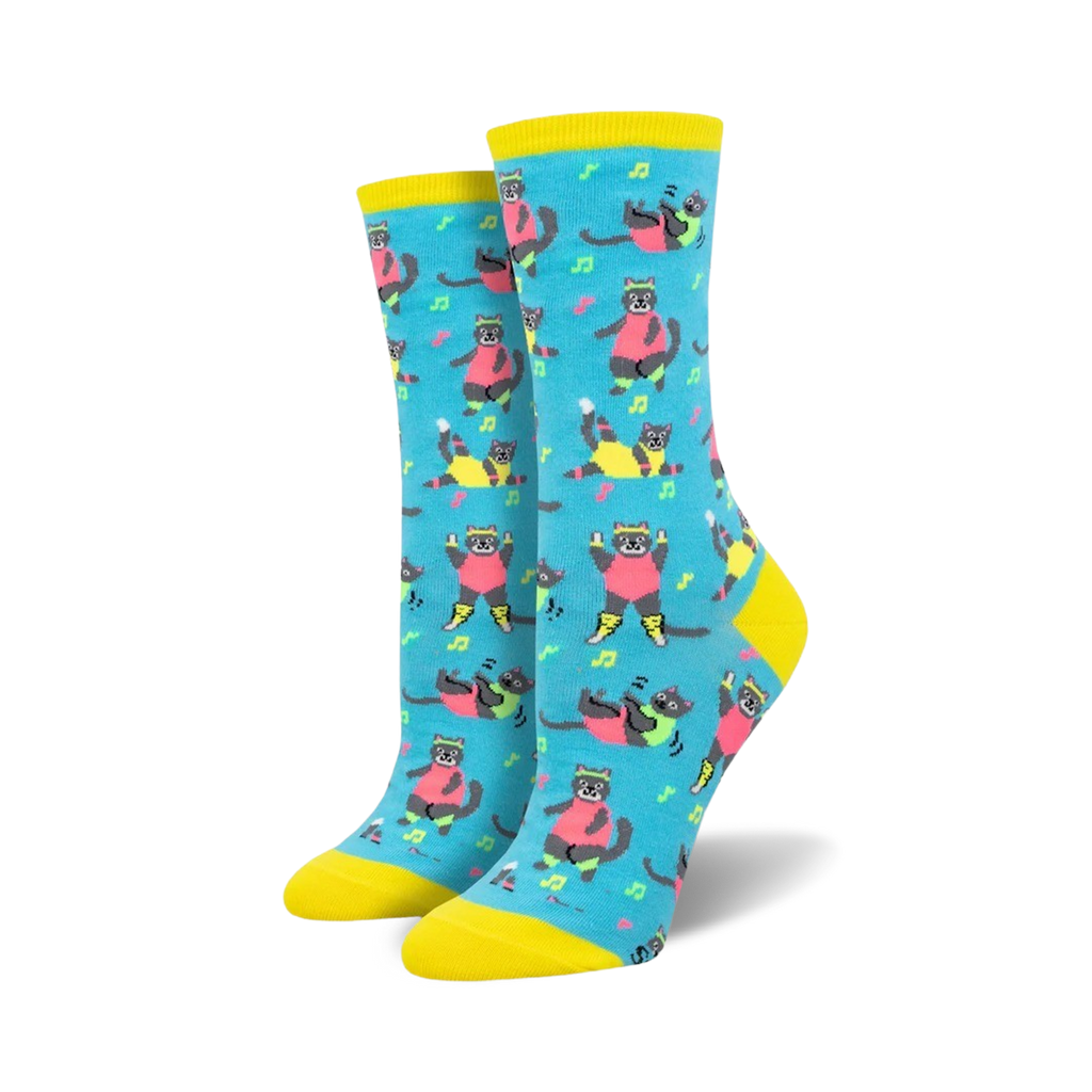 Unleash your inner feline aerobics queen with these Jazzercise Cats socks! Picture this: a crew of cartoon cats rocking leg warmers and busting a groove amidst musical notes. The bright yellow toe and heel, paired with the vibrant blue cuff and cuff, will make your feet the center of attention. These socks are perfect for adding some fun and energy to your workout wardrobe. Who said exercise can't be purr-fectly fashionable?