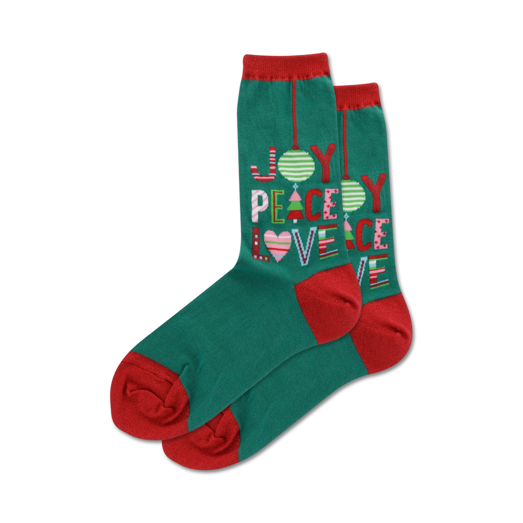 Get your feet ready for a jolly good time with our Joy Peace Love Christmas Crew Socks! These socks are bursting with festive cheer, featuring the words "JOY," "PEACE," and "LOVE" in red and white, surrounded by cheerful red hearts and green Christmas trees. Whether you're celebrating the holidays with friends and family or just spreading some cheer around town, these socks will put a smile on your face and everyone else's. Plus, they're made for women and come in a comfy crew length, so you can rock them all day long.