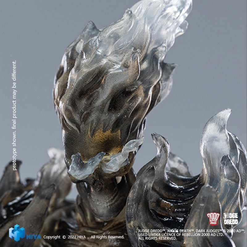 From Hiya Toys. A PREVIEWS Exclusive! The latest white hot variant action figure is the black and white Judge Fire! Hiya Toys and Rebellion are proud to announce another of the 1/18-scale PVC action figures in the eagerly anticipated range based on the world of Judge Dredd. Final member of the Dark Judges, Judge Fire is Clothed in eerie, lethal flames and carries his lethal trident, Fire brings death and destruction everywhere he goes! This PREVIEWS Exclusive black and white variant of the Judge Fire figure will come with 16 points of articulation, shoulder and joint pads, chain and badge of office, utility belt, and his mighty flaming trident.