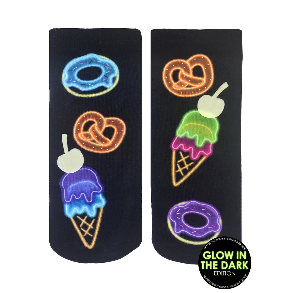 You're in for a sweet treat with our Junk Food Glow socks! These black ankle socks are splashed with a bright and cheerful pattern of donuts, pretzels, ice cream cones, and cherries that magically glow in the dark, making them the perfect accessory for your next late-night snack run.