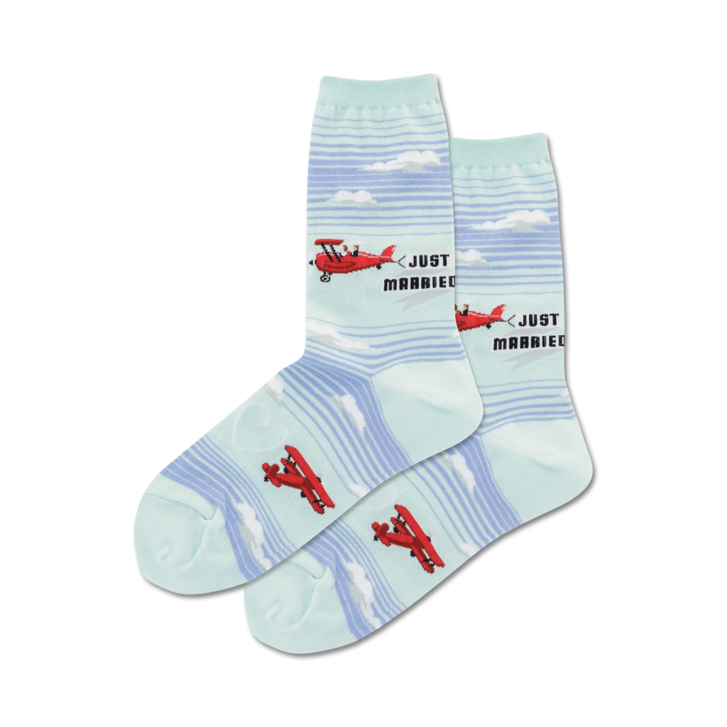 Soar high on cloud nine with these "Just Married Plane" socks. Picture this: a pair of socks adorned with bright red biplanes dancing across a cerulean sky, accompanied by the bold declaration "Just Married" in black letters. These crew-length socks are the perfect accessory for the stylish newlywed, adding a touch of whimsy to your special day. Slip them on and let your feet do the talking, announcing your newfound marital bliss to the world. Trust us, these socks will have you flying high literally and figuratively!