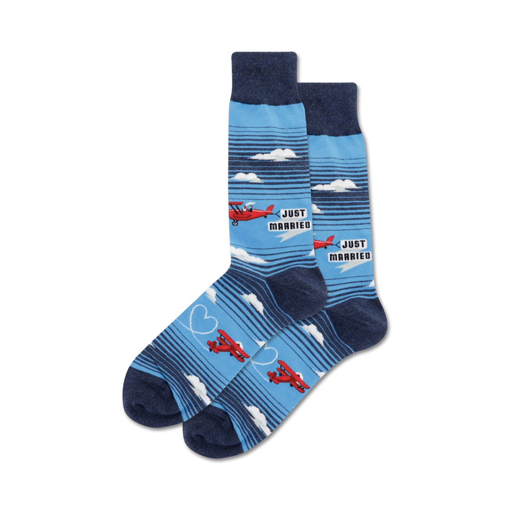 Just Married Plane Crew Socks for Men are a delightful memento for the newly hitched aviator twosome. Picture this: A handsome union of powder blue and vibrant scarlet, with a sky-high lineup of airplanes soaring amidst fluffy white clouds, all neatly arranged on a pair of socks. Sprinkle in the bold 'Just Married' inscription, and you've got a recipe for matrimonial bliss that's sure to leave everyone in the aisle swooning!