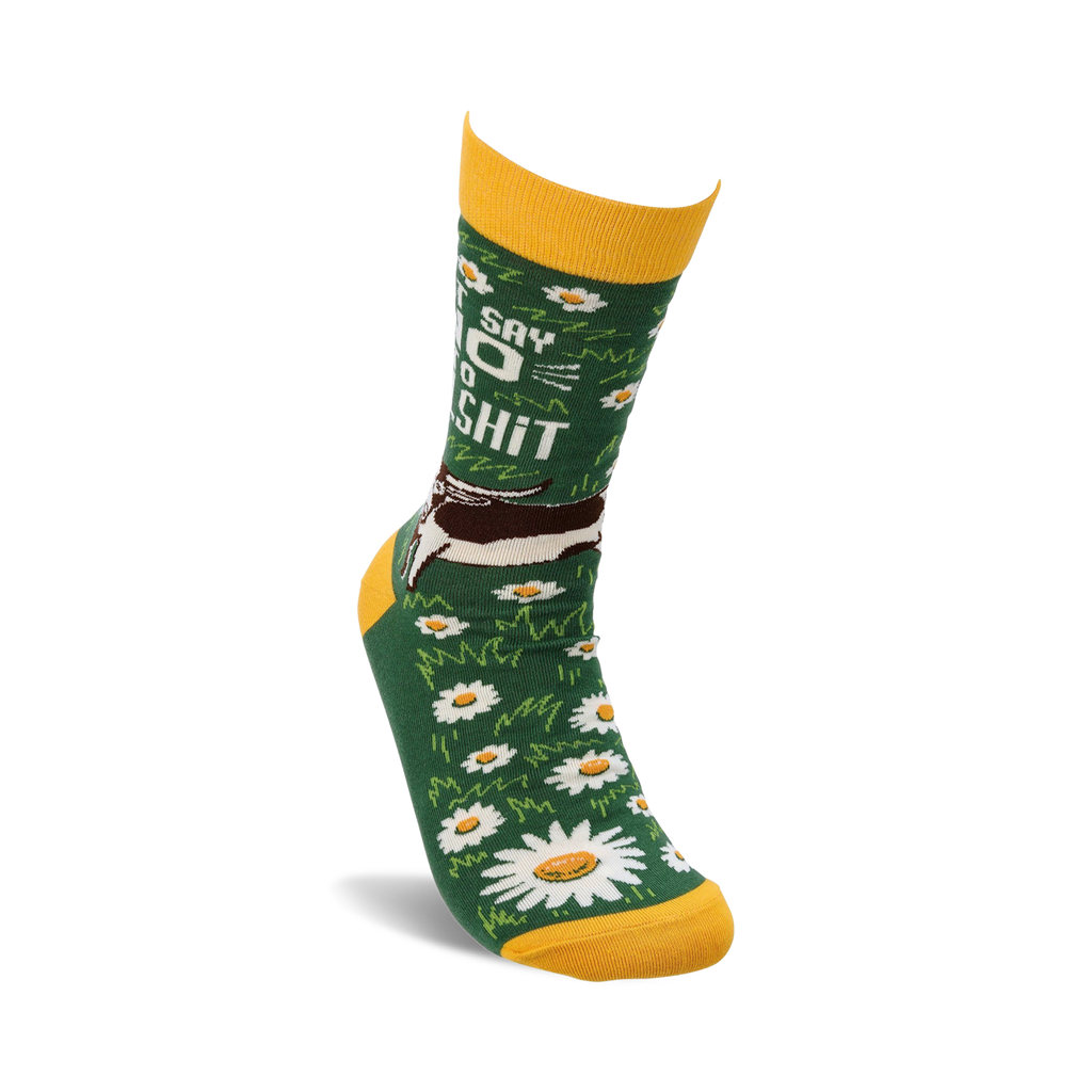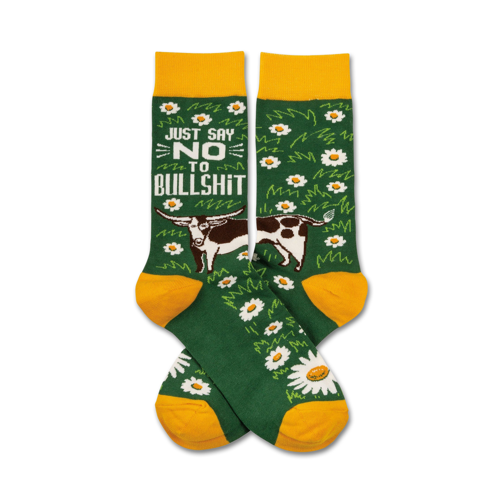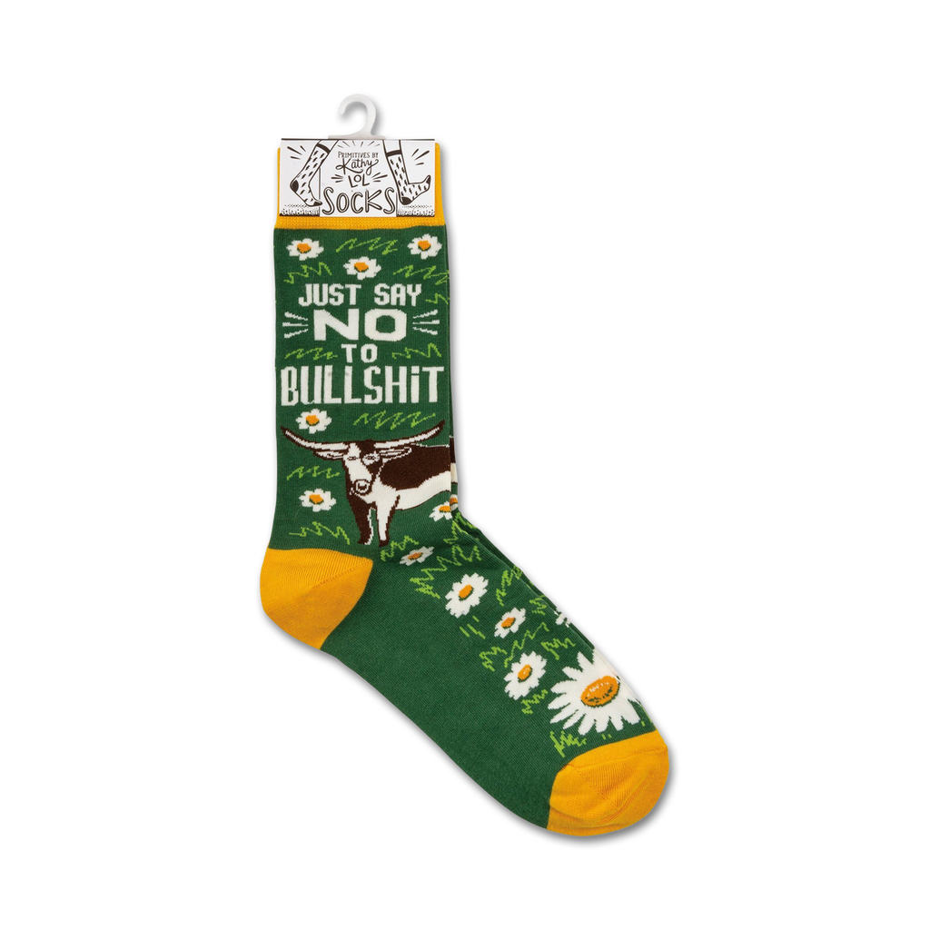 Sassy and subversive Just Say No To Bullshit socks! Prove you're not full of baloney with these knee-slappers. Daisy print. Bright yellow toes, heels, and cuffs. The perfect conversation starters for casual Fridays. Let your feet do the talking!