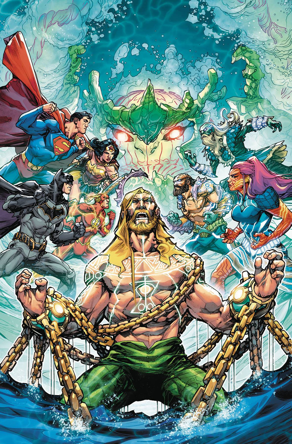 "Drowned Earth" part one! The Ocean Lords-ancient sea gods with a grudge against Aquaman and Wonder Woman-invade the Earth with an alien army and flood the globe. As Batman, Superman and the Flash race to stop the waters from rising and turning everyone into aquatic monsters, Mera seeks the advice of an old enemy, and Arthur must face down Black Manta...or lose his connection to the ocean forever!