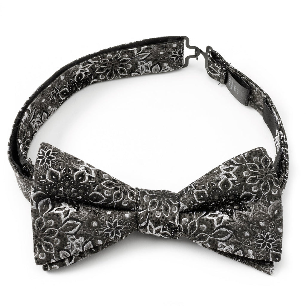 A unique and mesmerizing design, our Kaleido Floral Charcoal Men's Bow Tie features a black and white floral kaleidoscope pattern. With a fun and striking design, this bow tie is sure to be a conversation starter. A versatile style for any event. This bow tie is pre-tied for ease of dress and will maintain its shape thanks to being crafted with durable yet soft 100% Silk.