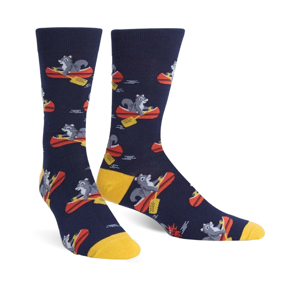 Imagine slipping into a pair of these socks and setting off on a paddling adventure with a crew of cartoon raccoons. These navy blue socks feature a pattern of red and yellow canoes filled with furry paddlers who seem determined to keep on paddling, no matter what obstacles they encounter. Perfect for anyone who loves the outdoors or just appreciates a good pun, these socks will add a touch of whimsy to any fall wardrobe.