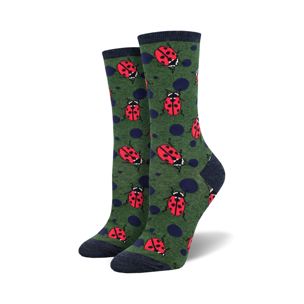 Meet the crew length Ladybugs socks ”socks that are as cute as they are vibrant. Decorated with polka-dotted ladybugs in bright red against a dark green background, these fun women's socks are sure to bring luck and style to your ensemble. Perfect for ladybug enthusiasts, nature lovers, and anyone with a playful side, these socks prove that "spots always hit the spot!"