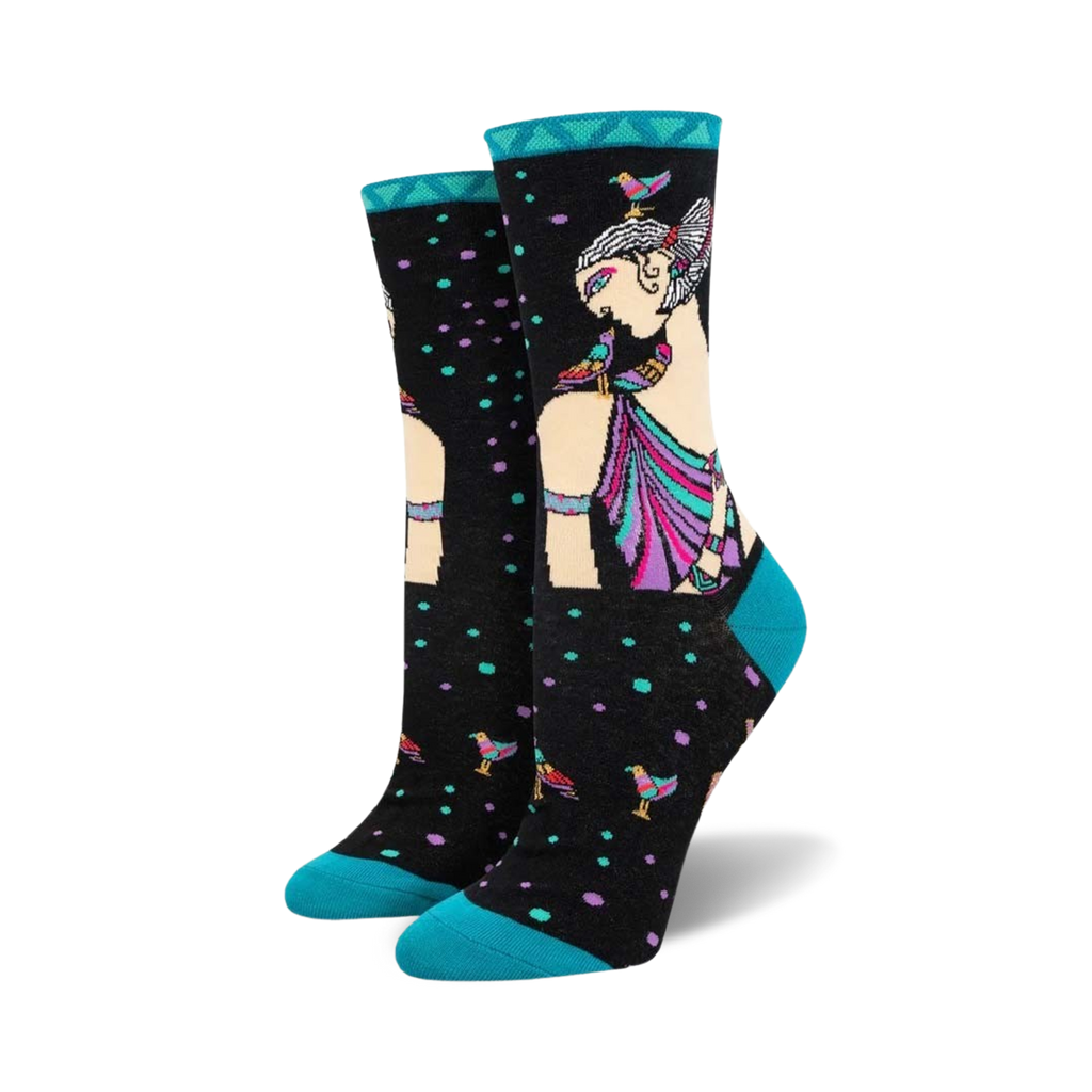 Jump into a flight of whimsy with our Laurel Burch Alka Socks! These eye-catching socks feature a vibrant pattern of a woman surrounded by a symphony of colorful birds. From the magnificent turquoise trim, bold blue toe and heel, to the purple dress of the woman and the brilliant blues, greens, yellows, and oranges adorning the birds, these socks are a kaleidoscope of artistic flair. Each pair is a celebration of color, creativity, and the magic of Laurel Burch's world. Get ready to turn heads and set imaginations soaring in these sock masterpieces!