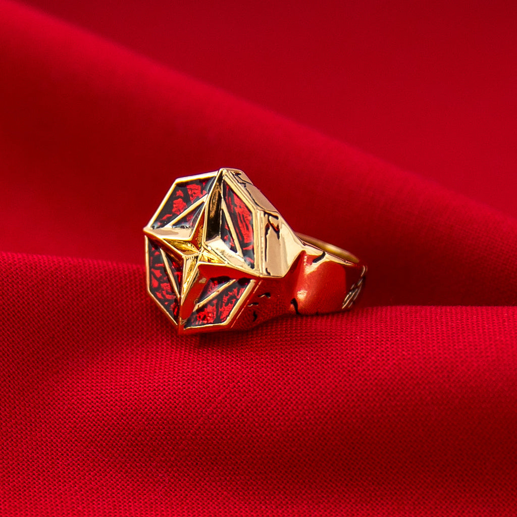 Handcrafted in gleaming 14K yellow gold plated nickel-free artisan brass, Ambessa’s ring is a faithful replica of the one worn by the strong and complex character on-screen in Arcane. To honor the warrior, the signet is deliberately distressed, its surface enhanced by blackener with artful dents and crevices that embrace the bold geometric angles of the ring shank. The top of the ring boasts the Medarda family seal – a sculpted four-pointed star design – encircled by deep red semi-transparent enamel, layered over etched texture to evoke the worn and weathered cracks of an ancient family heirloom. This ring channels both Ambessa's strength and her commanding presence, perfect for those who value boldness forged in fire.