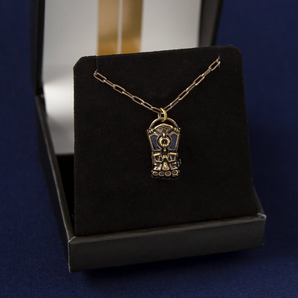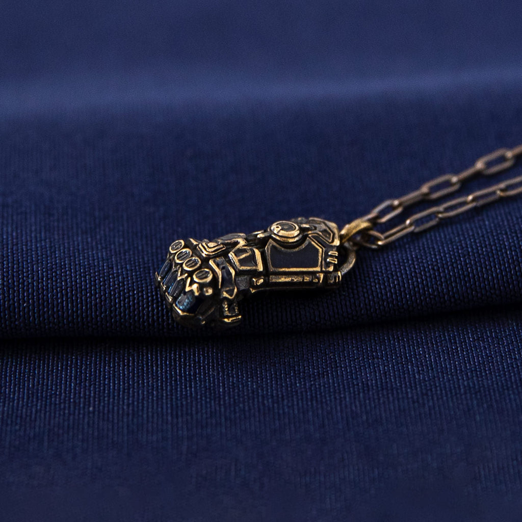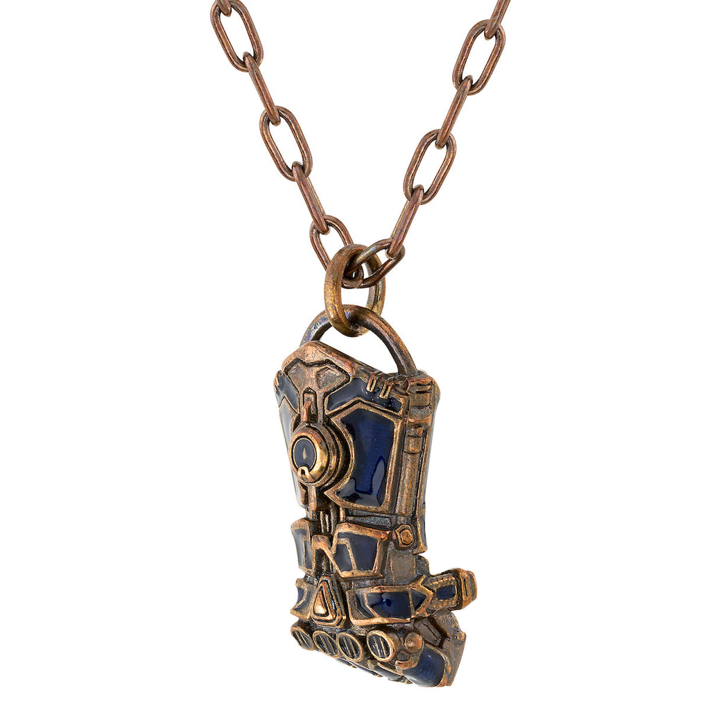 Handcrafted in durable artisan brass with a rugged antiqued finish, Vi’s Gauntlet is immortalized in ornately sculpted compact miniature. Three-dimensional and faithfully accurate to the gauntlets Vi wears on-screen, the warm brown of the antiqued brass is offset by hand-painted premium enamel in striking navy blue. The pendant hangs from a matching antiqued brass adjustable curb chain.