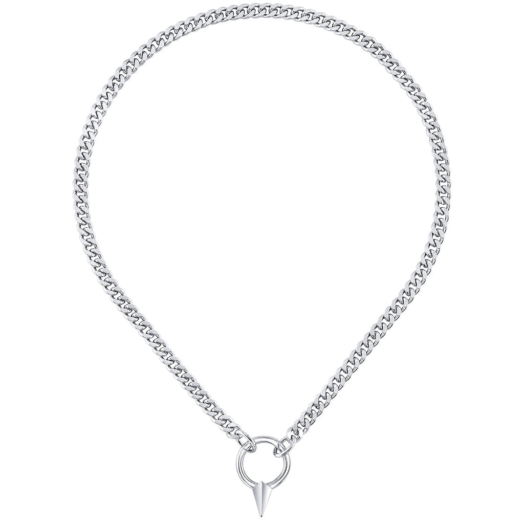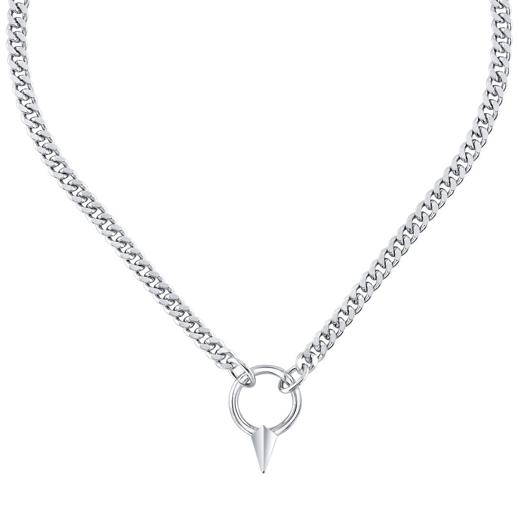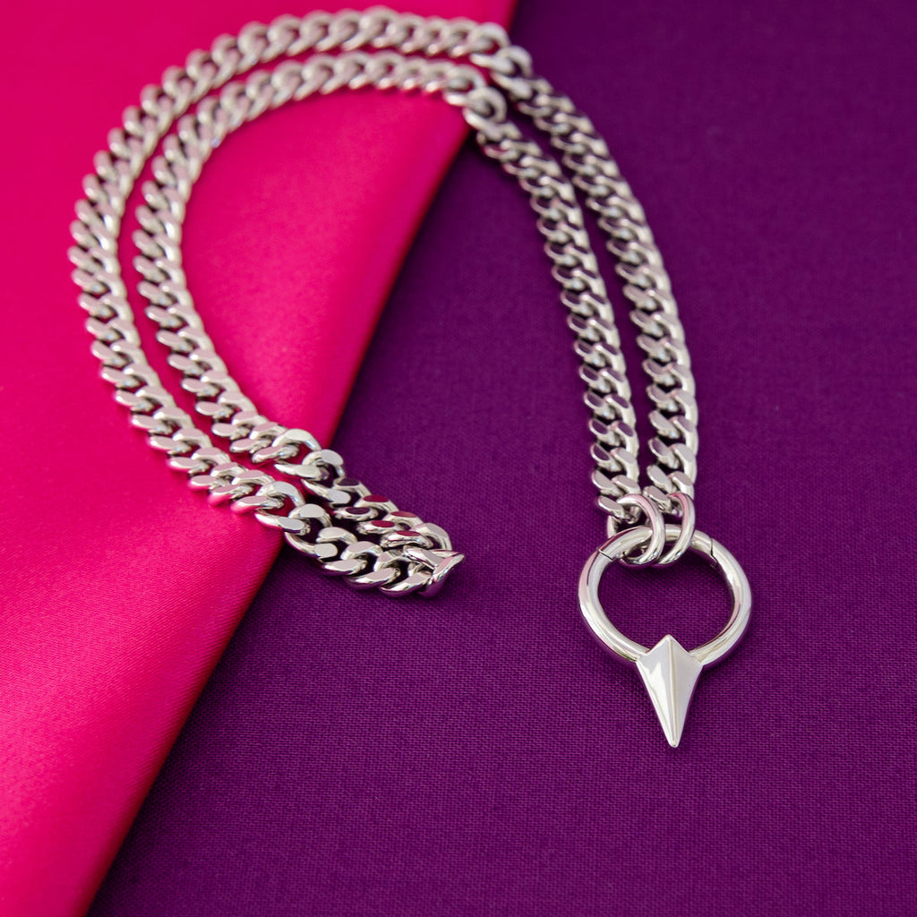 Handcrafted in nickel-free artisan brass and plated in a thick layer of polished white rhodium, the HEARTSTEEL Necklace is a must-have accessory for League of Legends and music fans. Unisex and effortlessly edgy, the on-trend curb chain is enhanced by a custom clasp in the HEARTSTEEL signature spiked hoop silhouette. Depending on your size, the length of chain can also be worn wrapped around the wrist, the clasp closing deftly with a clever spring hinge.