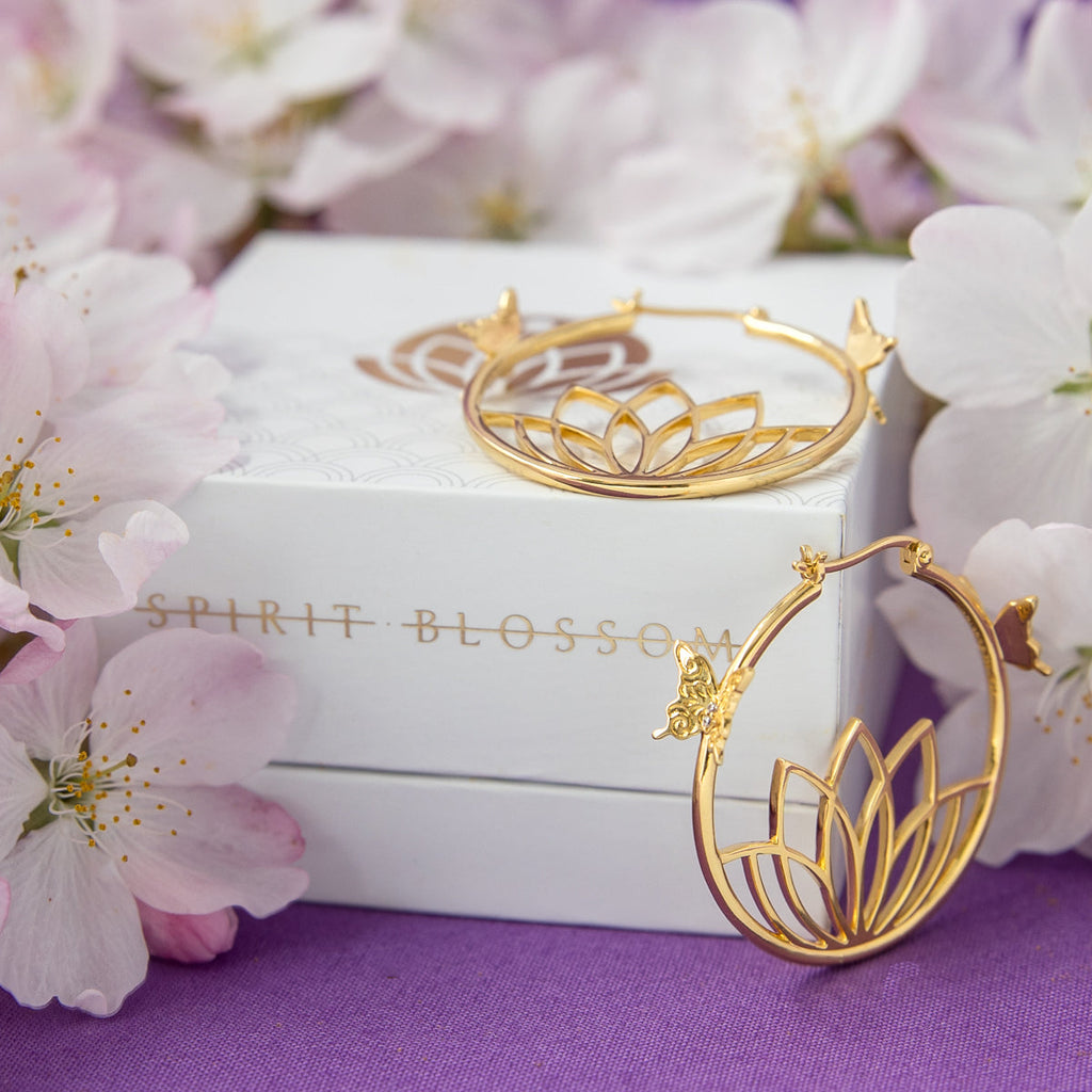 Handcrafted in gleaming 14K yellow gold-plated nickel-free artisan brass, the Spirit Blossom Syndra Hoop Earrings are a delightfully elegant accessory embodying everything the Spirit of Freedom represents. The round hoops showcase a cutout lotus flower design adorned with two intricately detailed butterflies perched on the outer rim. Each butterfly features engraved scrollwork and is accented with two sparkling white cubic zirconia crystals. The hoops are secured with 14K yellow gold-plated nickel-free sterling silver hinged ear wires and offer a lightweight, comfortable fit perfect for everyday wear.
