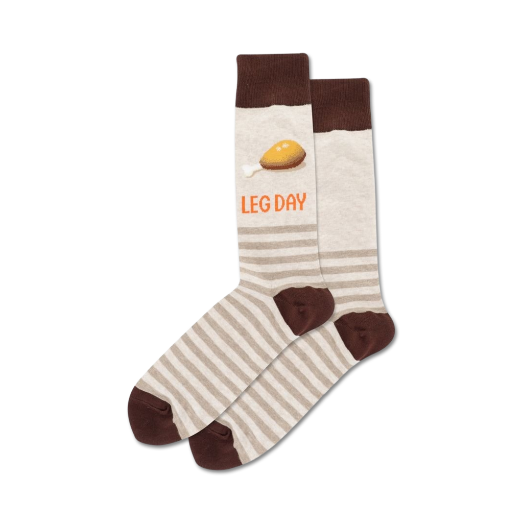 Get ready to strut your stuff on Thanksgiving Day in these Leg Day novelty socks! These mid-calf socks feature brown toes, heels, and cuffs, a white body with a light brown stripe pattern, and a graphic of a drumstick with the words "Leg Day" in bold letters. Turkey day just got a whole lot more fun!