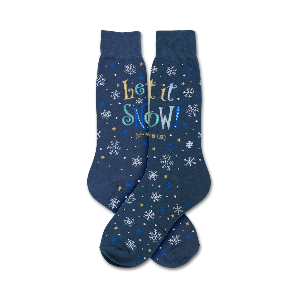 Escape those frosty tootsies with a pair of Let It Snow ¦Somewhere Else novelty socks. These blue crew socks have a pattern of snowflakes and the words "Let it Snow" in gold and green, with the cheeky addition underneath of "somewhere else" in parentheses. A perfect gift for anyone who dreams of a warm Christmas or who just wants to add a festive touch to their everyday wear.