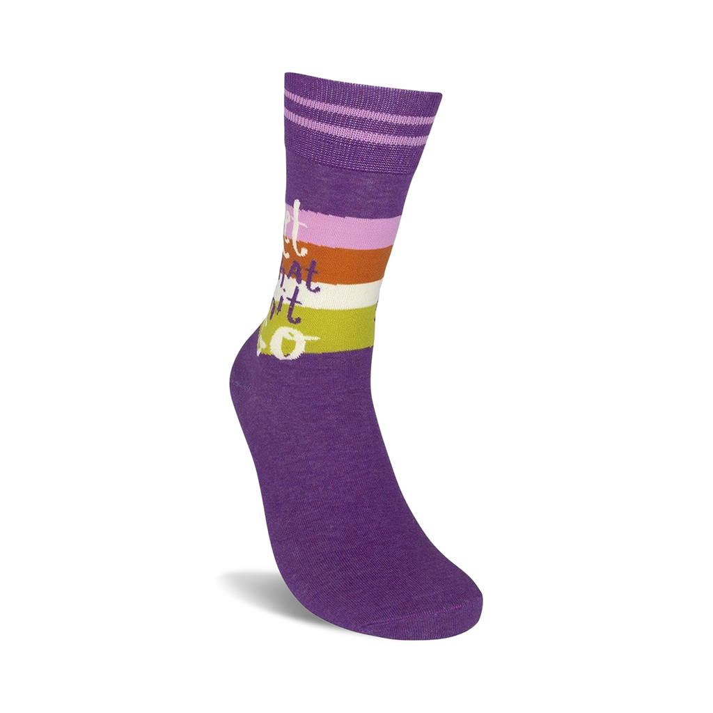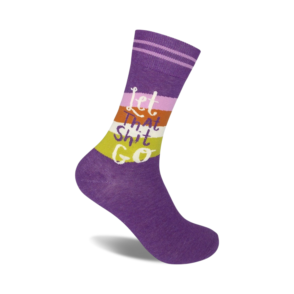 Look alive and kick your wardrobe into high gear with these purple "Let That Shit Go" crew socks for women. Colorful letters and iconic graphics encourage you to let go of negative thoughts and embrace a positive outlook. Socks like these are sure to be a hit with those seeking motivational and fun fashion accessories.