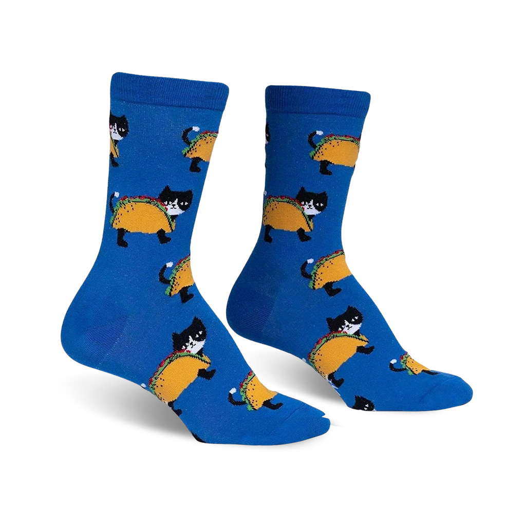 Strolling around with your head in the proverbial tacos while kitties are lounging in them will be as easy as pie when you sport these "Let's Taco 'bout Cats" novelty crew-length women's socks. You'll be having a ball as you trip the light fantastic and make a splash among your acquaintances. What are you waiting for? Don't let your paws be without these purr-fect taco treats!