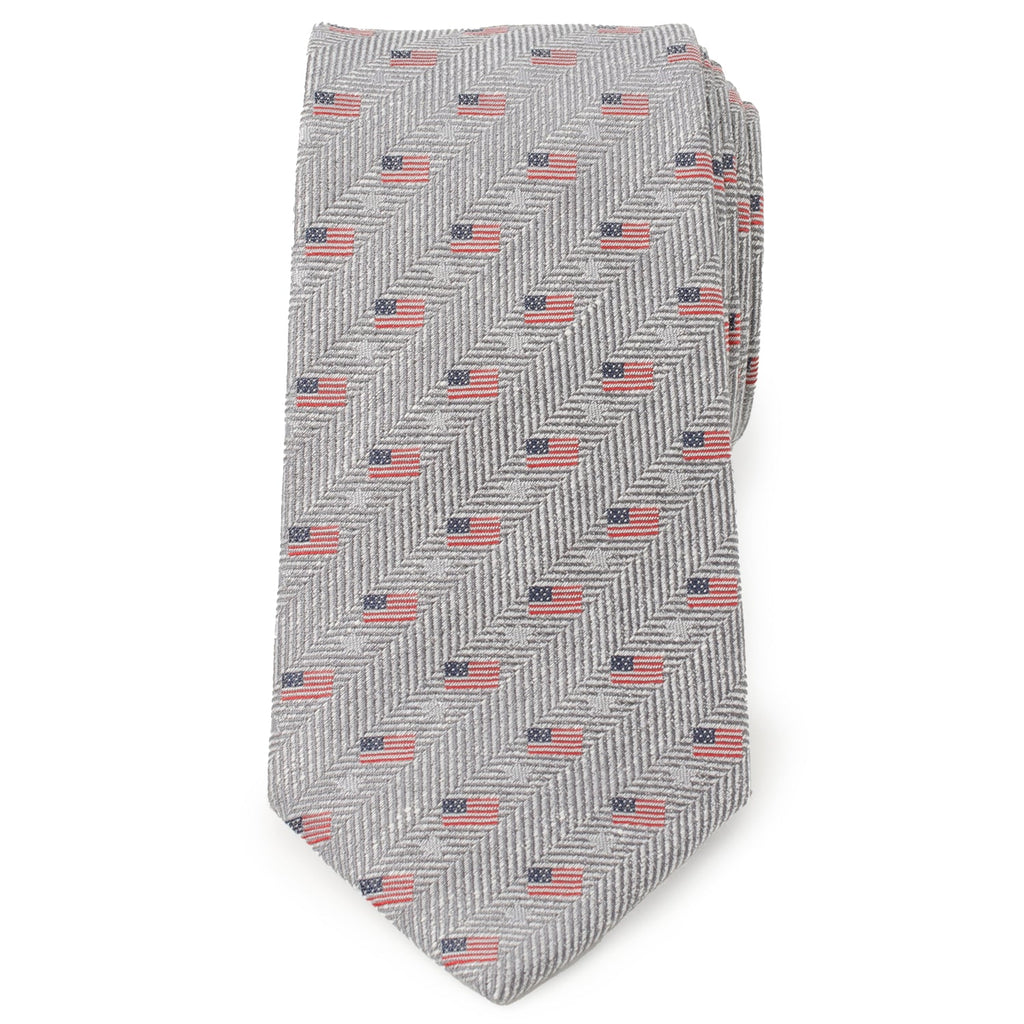 Cotton-soft gray linen knit into a neat herringbone design makes up our elegant yet patriotic Light Gray American Flag Men's Tie. Rows of American Flags with gray tonal stars decorate and enhance this tie. Can be worn for President's Day, Memorial Day, Independence Day, and Labor Day. Our tie will maintain its shape thanks to being crafted with sturdy yet breathable 100% Cotton.