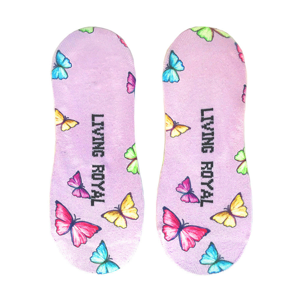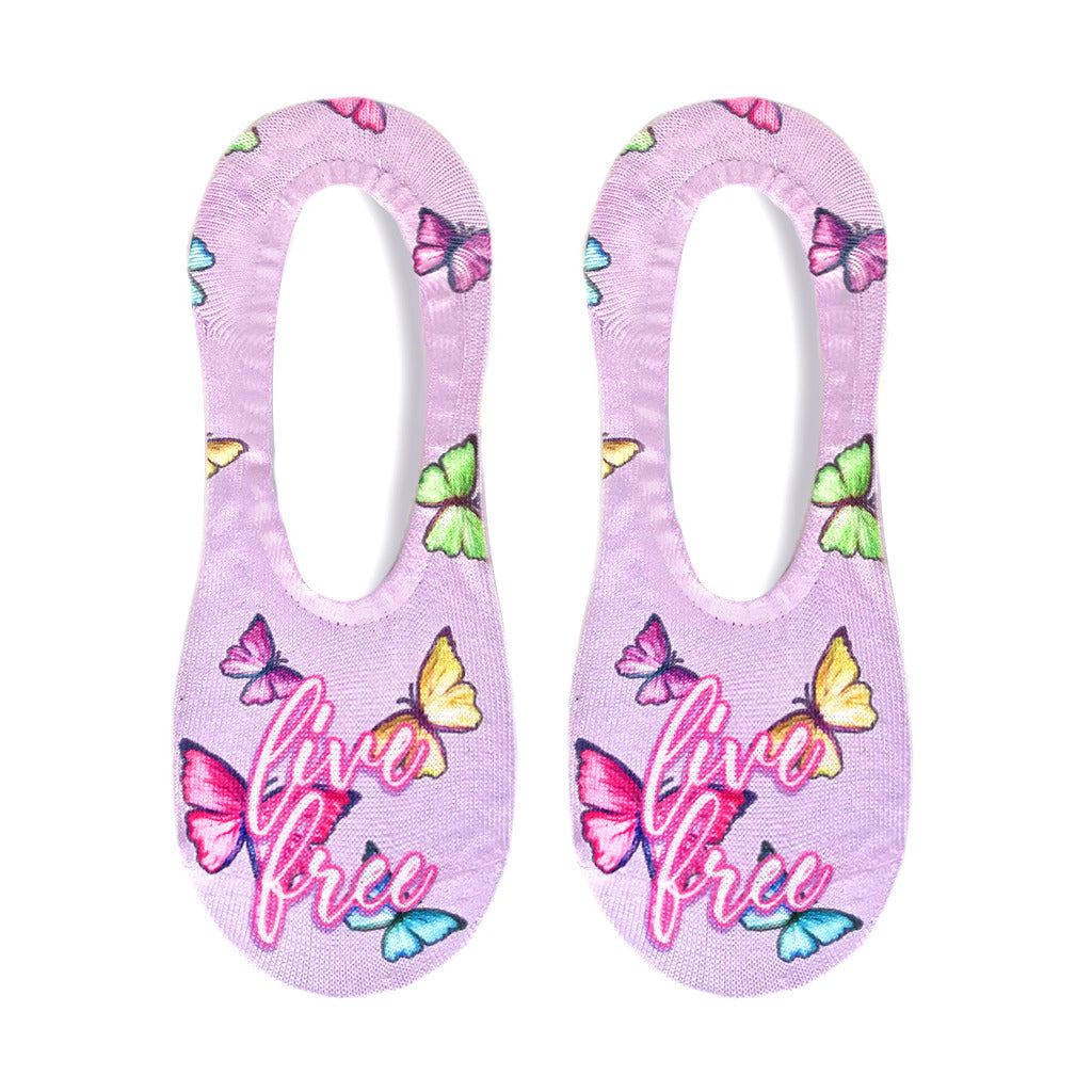 Live Free with our limited-edition Butterfly socks! These purple, liner-length, women's accessories are a colorful ode to freedom and feature bright butterflies paired with the inspiring words 'Live Free' on the bottom of each sock. When you put on these socks, you'll feel like you can do anything. So go forth and flutter your way through life with style and confidence.