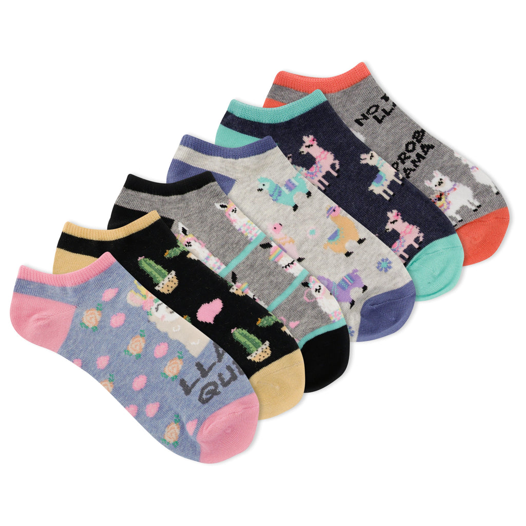 Six pairs of no-show socks featuring a fun llama theme. The visible designs include llamas in various poses and colors, some with cacti and hearts. There's a pair with a light blue background and pink accents, another with gray and teal stripes, and a dark pair with llamas and cacti. The colors are bright and cheerful. The socks are shown folded, so the complete pattern of each pair isn't visible on all of them. They’re perfect for adding a little quirky fun to your footwear.