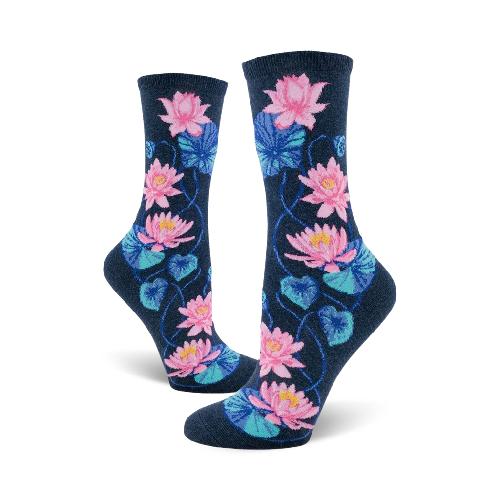 These dark blue Lotus Flower socks are blooming with funky pink and blue flowers. Each flower has a unique pattern with multiple petals. And the pointed green leaves complement the floral pattern and bring it to life!