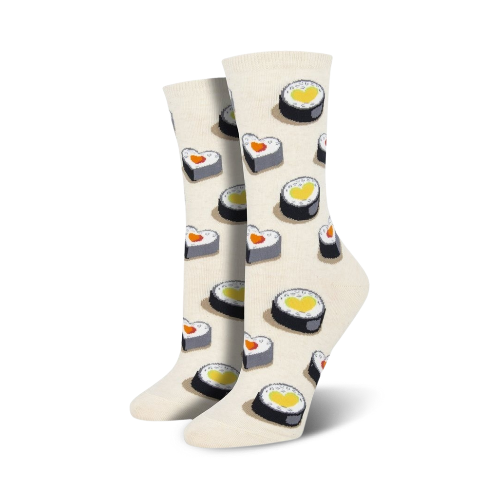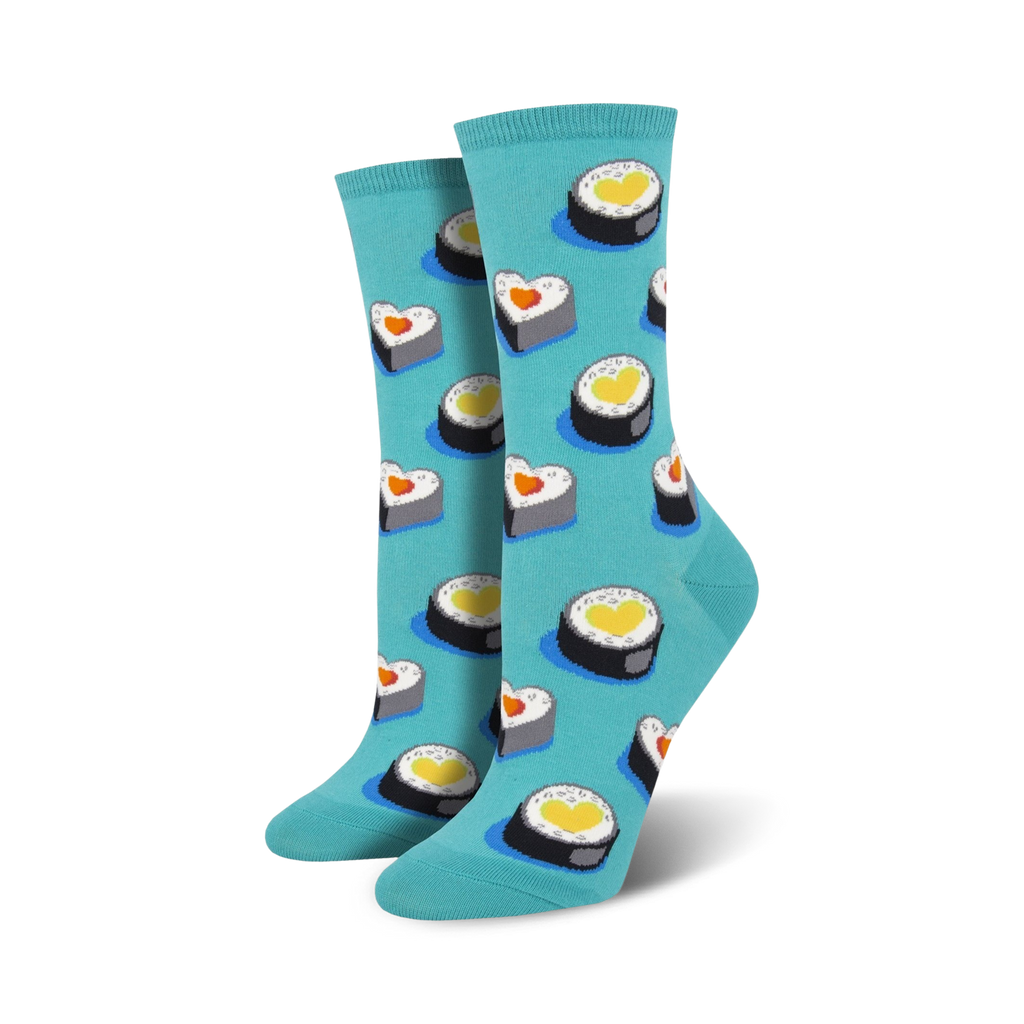 Dive into the world of sushi with these Love At First Bite socks! Feast your eyes on a mouthwatering pattern of blue sushi rolls, adorned with a red heart in the middle. Made for women, these crew-length wonders are the perfect fit for sushi lovers who want to add a dash of fun to their wardrobe.
