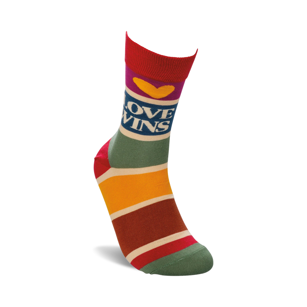 Love Wins socks are like a warm, fuzzy hug for your feet! With colorful stripes, a yellow heart, and the words "Love Wins," these socks will make you feel happy and hopeful. They're perfect for spreading love and positivity wherever you go. Fun fact: Did you know that smiling can actually make you happier? Put on these socks and let the love win!