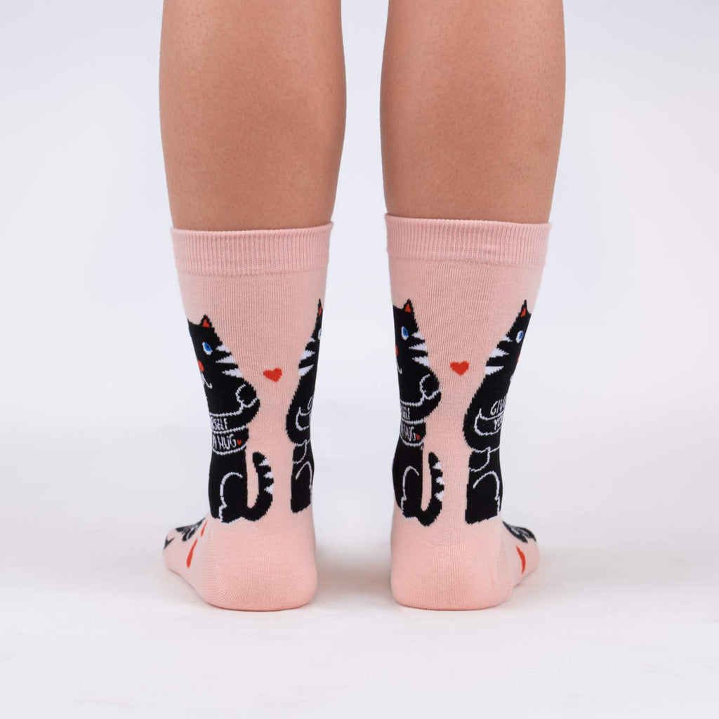 Need a little self-love? These socks feature a delightful pattern of black cats giving themselves hugs, a message we can all appreciate. They're a pale pink with cute little red hearts scattered around. The visible parts of the socks show the cats in various poses, each with a banner that reads 'Give Yourself A Hug'. Seriously adorable and surprisingly comfy – perfect for those days when you need a boost of happy.