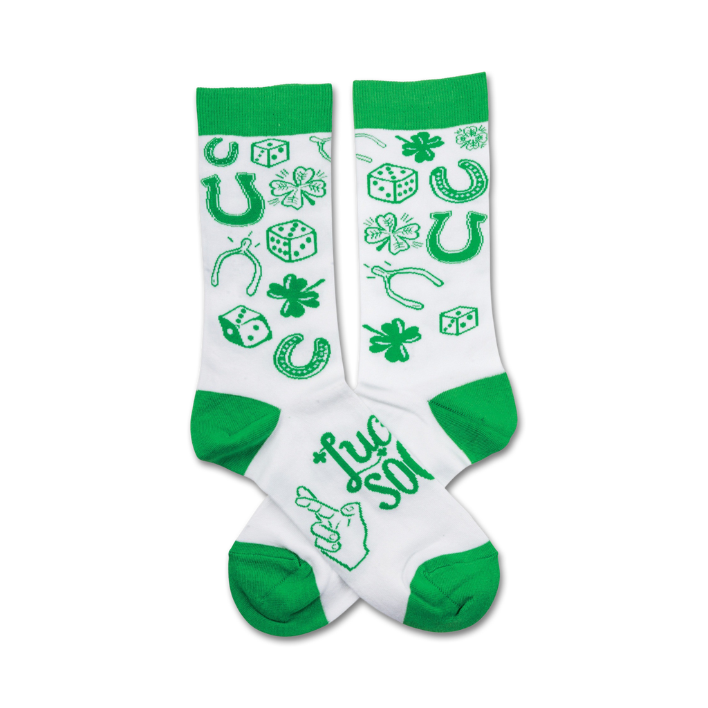 Feeling lucky? Feeling Irish? Slip on a pair of St. Patrick's Day-themed Lucky Crew Socks! These mid-calf socks are covered with green four-leaf clovers, horseshoes, dice, wishbones and pointing hands, sure to bring some of the luck of the Irish your way. The Lucky Soul lettering on the lower half of these socks will remind you to keep your chin up and enjoy the rainbow after every storm.