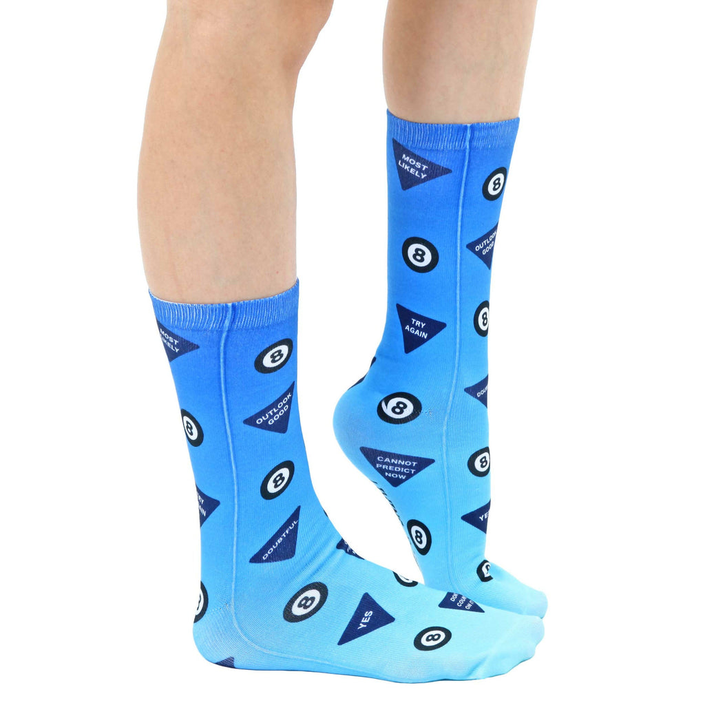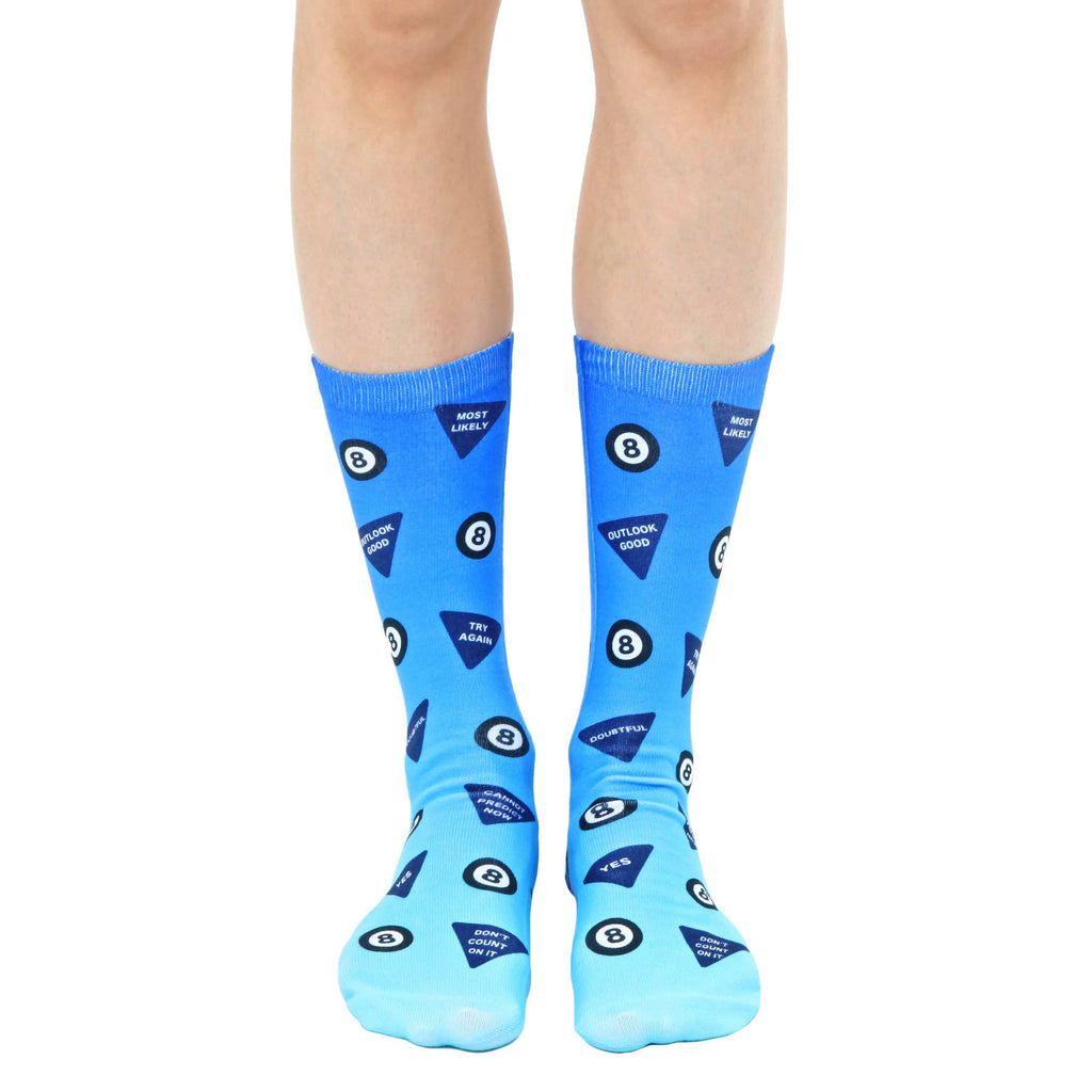 Magic 8 socks got you covered - when you need a fun answer don't sweat. Sometimes we need help making decisions, no matter how big or small. Magic 8 socks are like having a fortune teller on your feet, they might not be the most reliable, but they sure are fun! Crew socks designed for both men and women, these blue socks have a pattern featuring the responses "most likely," "outlook good," "try again," "doubtful," "yes," and "don't count on it."