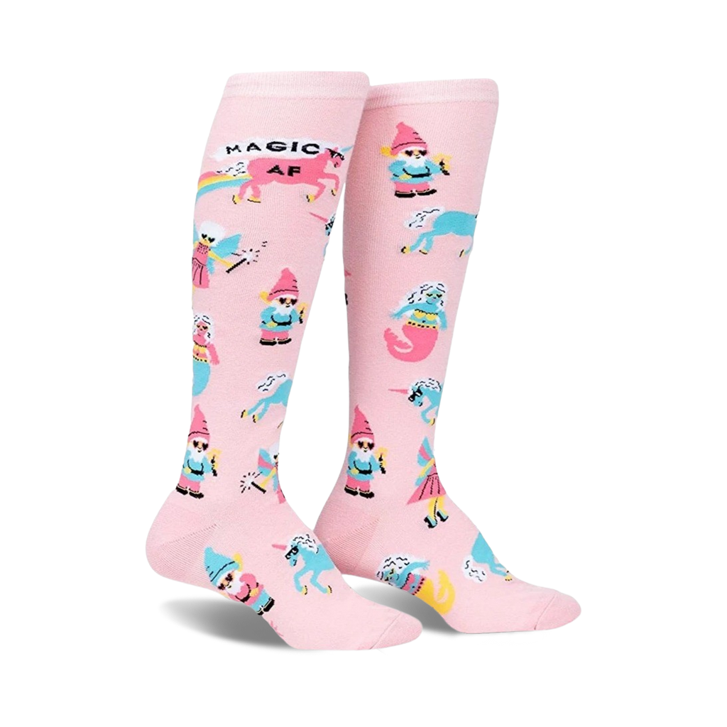 Prepare to be enchanted with Magic AF socks! These pink knee-highs feature a whimsical gathering of unicorns, wizards, gnomes, and mermaids that'll transport you to a world of magic and wonder. Plus, these socks are built to last - just like a magical sword! Step into a world of mythical fun and let your toes join the adventure!