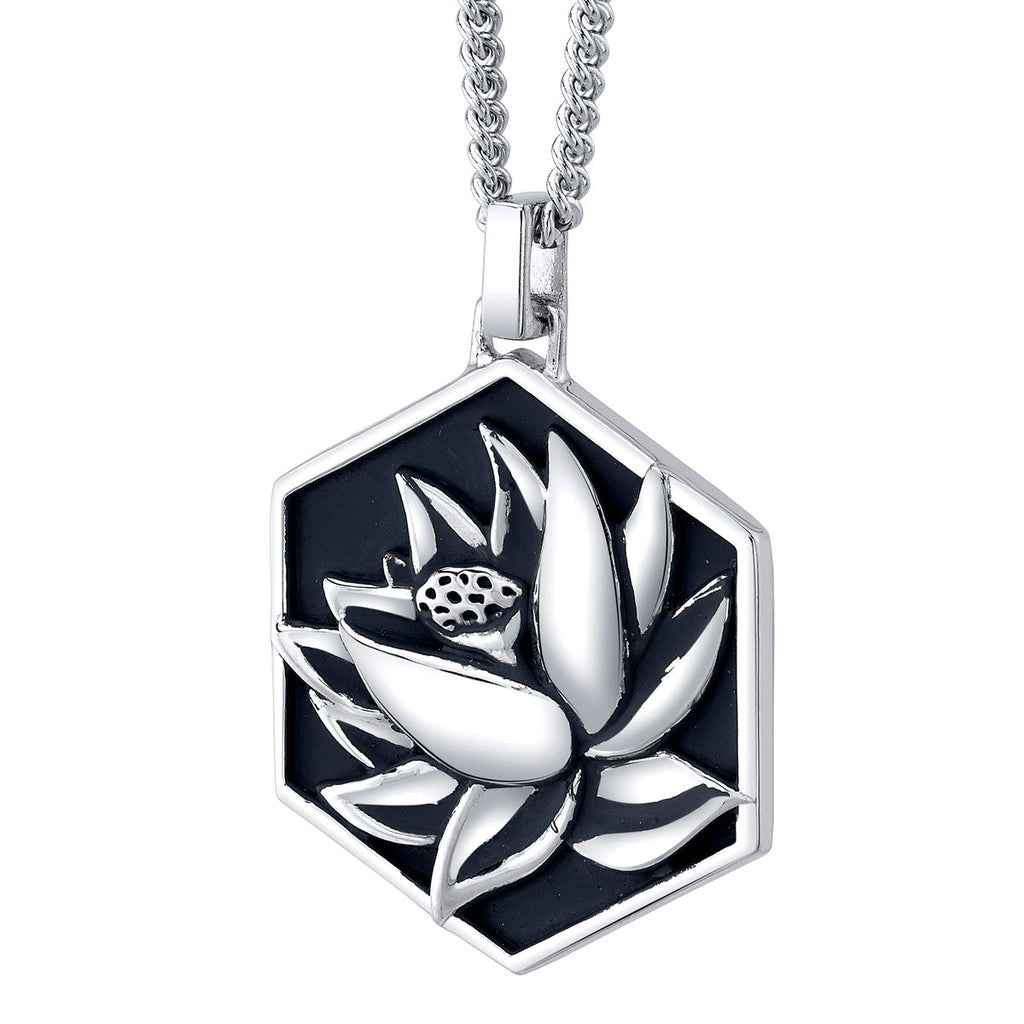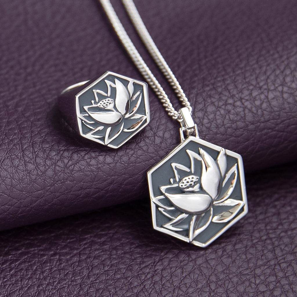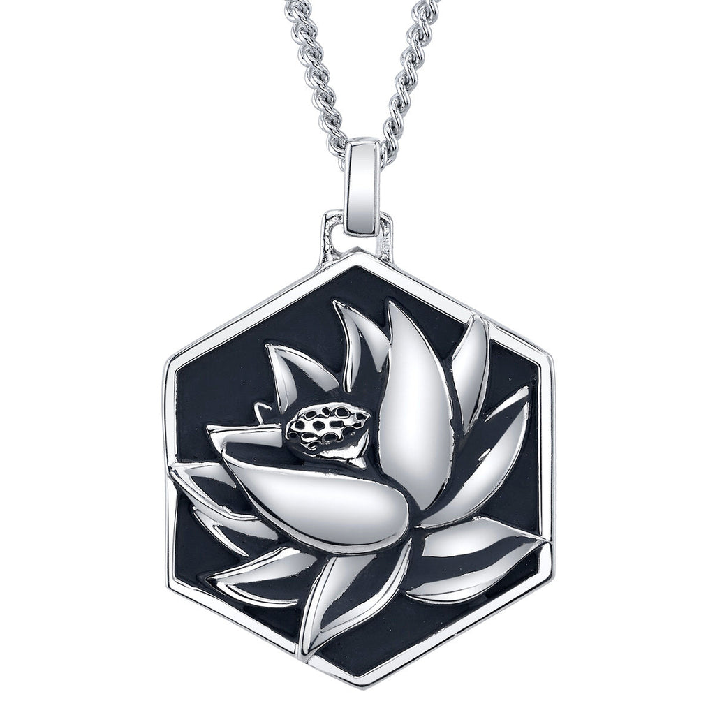 Handcrafted in solid sterling silver and meticulously faithful to the original card art, the Black Lotus Medallion features a bold hexagonal silhouette. Brightly polished, the iconic Black Lotus is showcased in carved relief, and blackened to enhance the detailing and the negative space between petals and frame. The reverse features the engraved Magic: The Gathering logo, Planeswalker emblem, and LE 500. Balanced by an equally hefty weave, the substantial pendant hangs from an adjustable 24 inch sterling silver curb chain.
