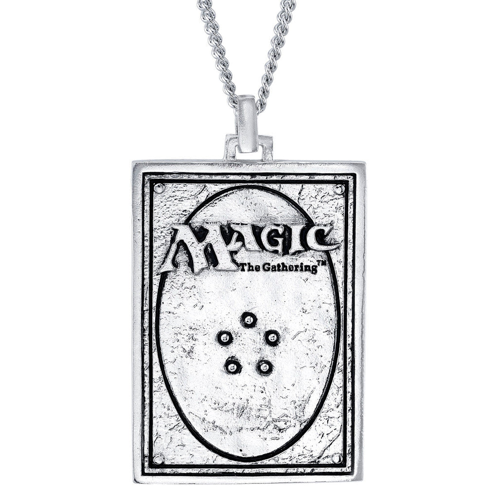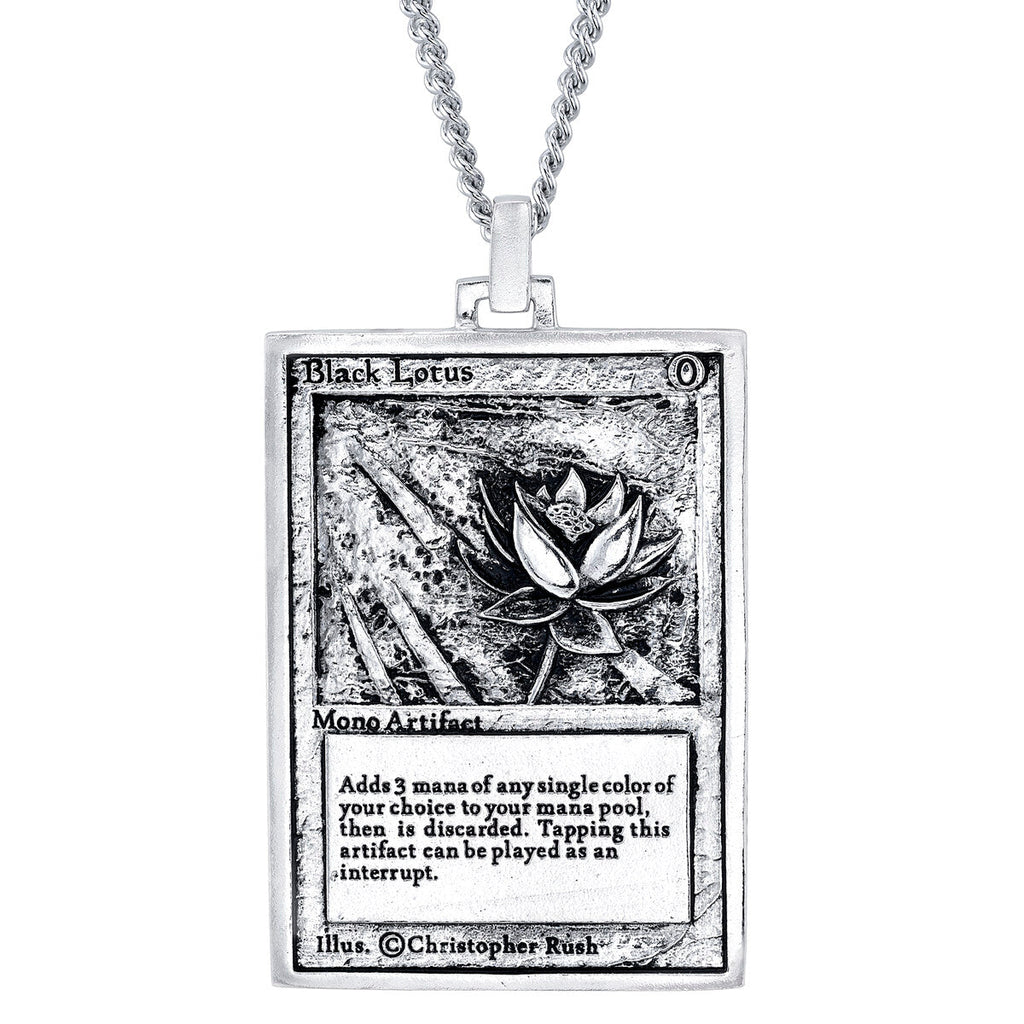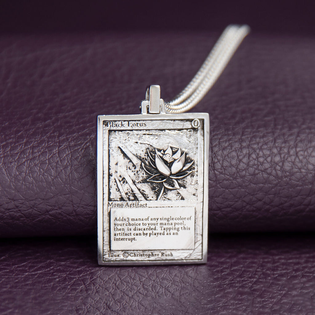 Handcrafted in polished solid sterling silver and antiqued to accentuate detail, the Black Lotus Mini Card Necklace is meticulously faithful to the original card art. On one side of the pendant, the iconic Black Lotus card art is showcased in carved relief, surrounded by texture to emulate the sunlit background in the original illustration. The card name, mana cost, type line, and card artist are all accurately engraved in the authentic Magic: The Gathering fonts. On a slightly raised surface, the text box is painstakingly transcribed in minute type, line for line.
