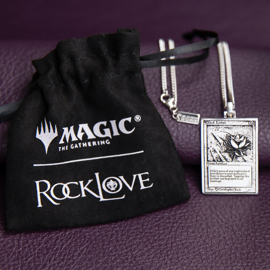An exquisite treasure, the Black Lotus has long been considered the most valuable Magic: The Gathering card. Part of the Power Nine, the Lotus is highly regarded for its ability to accelerate mana and cast powerful spells in the defeat of one’s adversary. An homage to the fantastical illustrations created by the late artist, Christopher Rush, RockLove is honored to bring the Black Lotus to life in this official licensed Magic: The Gathering X RockLove Black Lotus Mini Card Necklace.