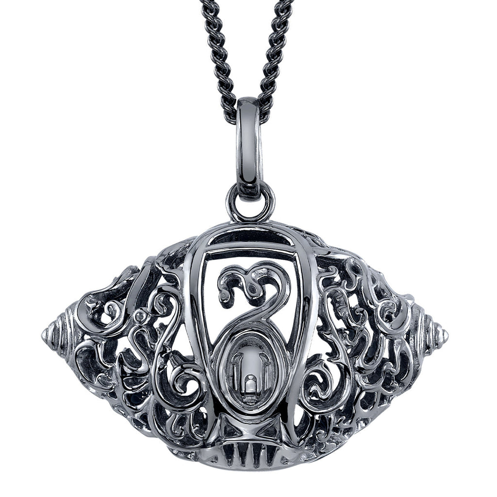 Carved in solid sterling silver, featuring a thick layer of polished gunmetal black rhodium, Mishra’s Bauble Necklace is meticulously detailed with intricately carved cutout scrollwork. Double sided, the gleaming almond-shaped ornament perfectly matches the swirling details of the original card artwork. Three-dimensional and hollow within to allow light to shine through the complex pattern, the pendant hangs from a matching black rhodium plated adjustable 24-inch sterling silver curb chain.