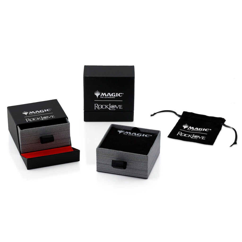 This Magic: The Gathering X RockLove jewelry design is a limited edition of 500 units. Every piece arrives in a signature Magic: The Gathering X RockLove Collector's Dice Box, with black exterior and “Mythic Orange” interior. The box flap opens to reveal a slide-out compartment, printed with the side image of stacked Magic cards. The jewelry nestles within branded soft black flocking and includes an additional black fabric drawstring travel satchel with silkscreened logos. A compelling addition to any display case.