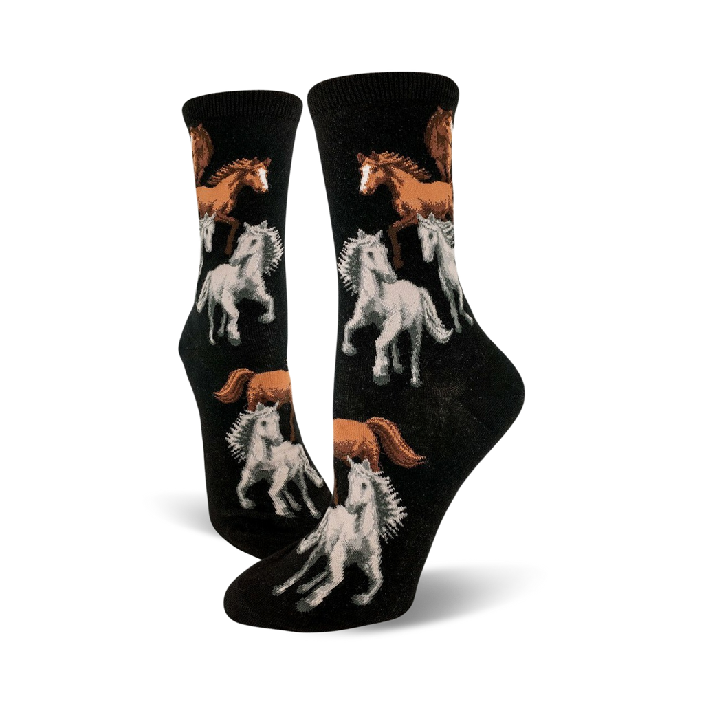 Majestic Horses, the socks that will make you neigh with joy! With black backgrounds galloping with these cartoon horses, you'll feel like you're living the high life. They're perfect for wearing to the stable or just running errands around town. Plus, they make a great gift for any horse lover!