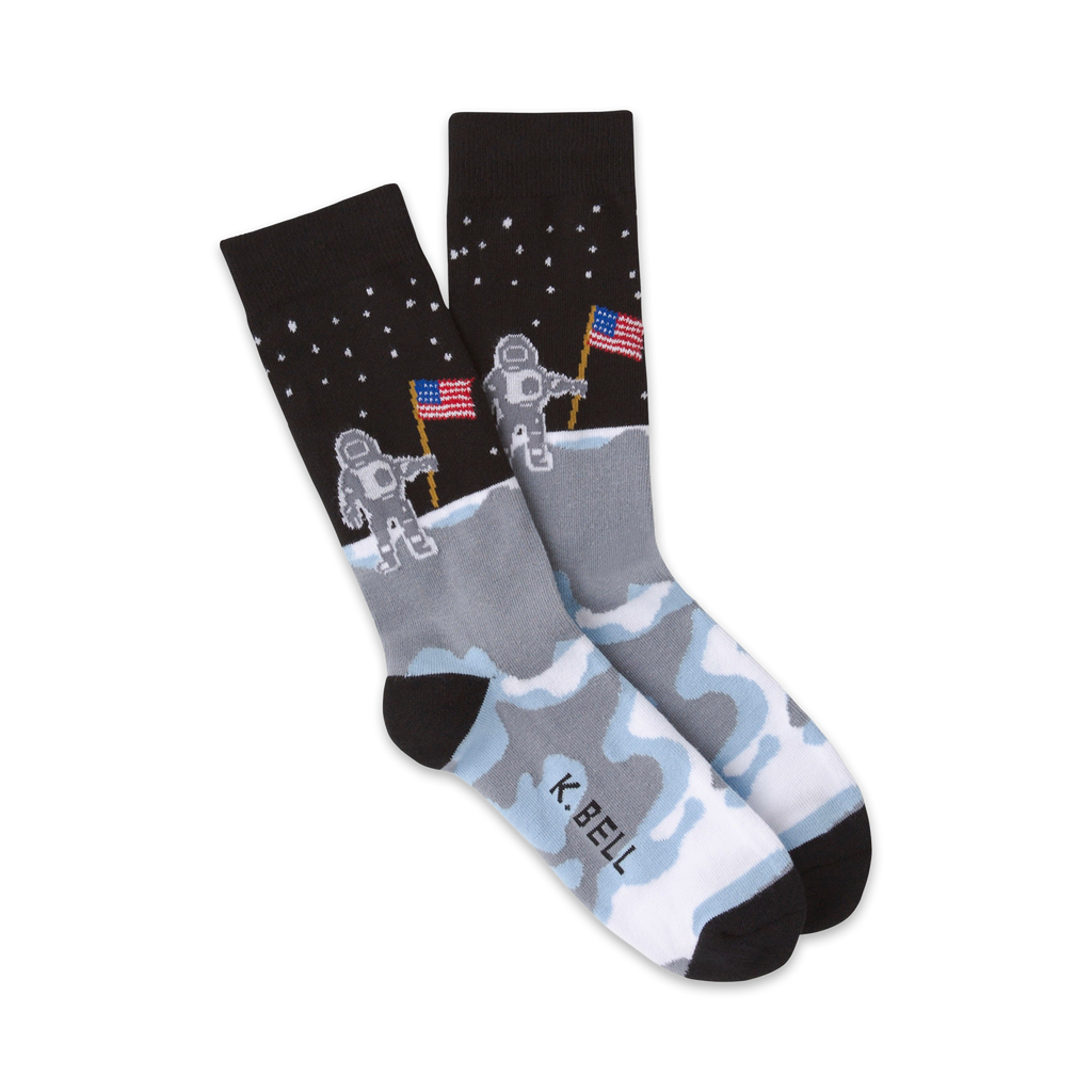 Taking a break every now and then is important. We all need our space! This cool pair of black crew socks will show everyone that your love for the moon is not just a phase. Each fun sock features a moon surface print with an astronaut placing the American flag into its spacey soil.