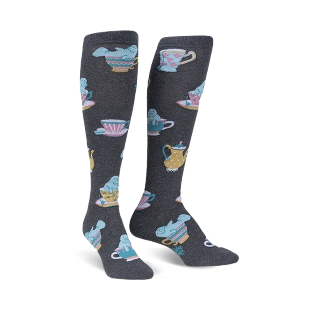 Mana-tea: Knee High Socks - A Splash of Whimsy Dive into a swirl of knee-high delight with our Mana-tea socks! Picture this: adorable manatees in quirky hats, hosting their own tea party. Their gray, blue, and pink suits complement the vibrant teacups and teapot. Like a gentle reminder that even the gentlest giants deserve a spot at the table, these socks radiate charm and cheer. So, step into a world of Mana-tea and let your feet join the party!
