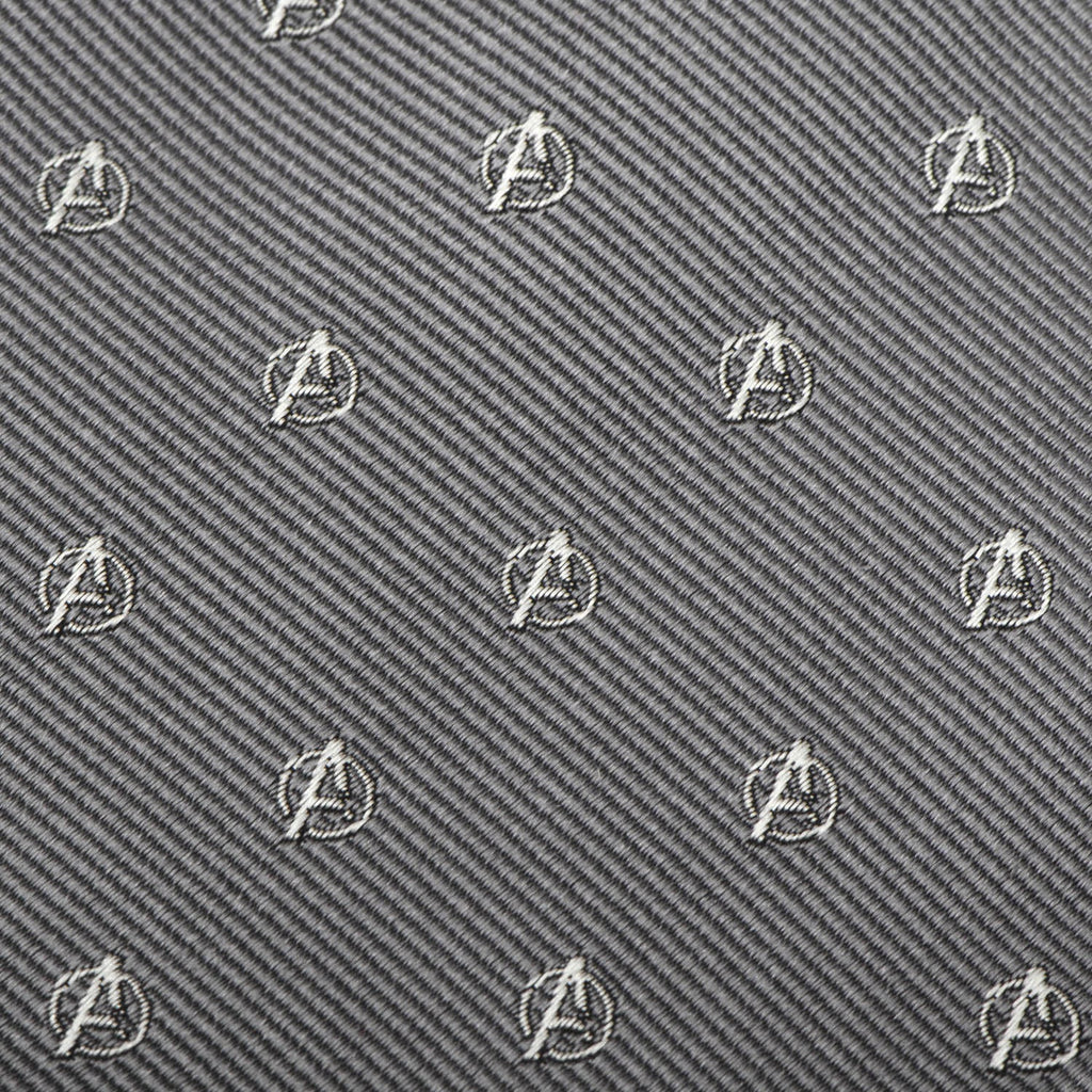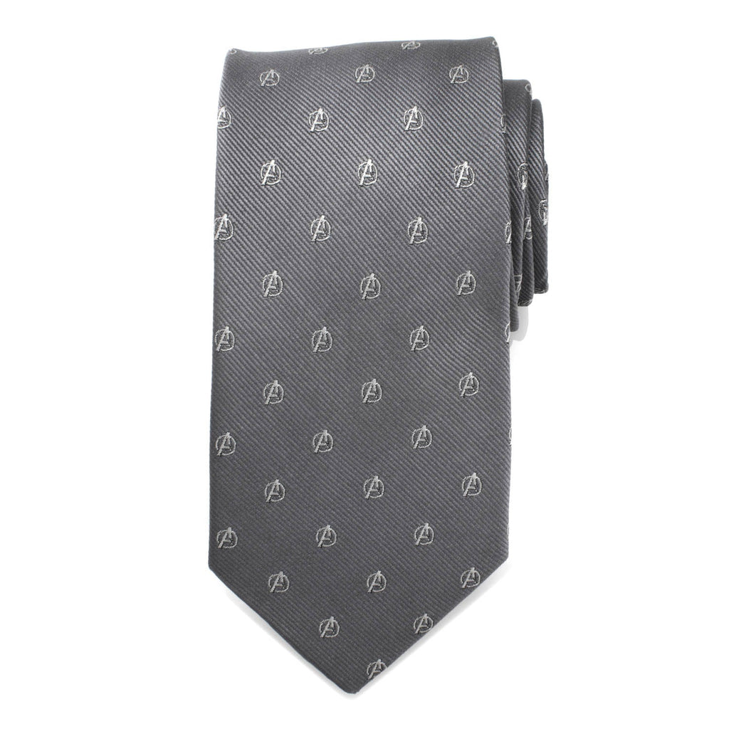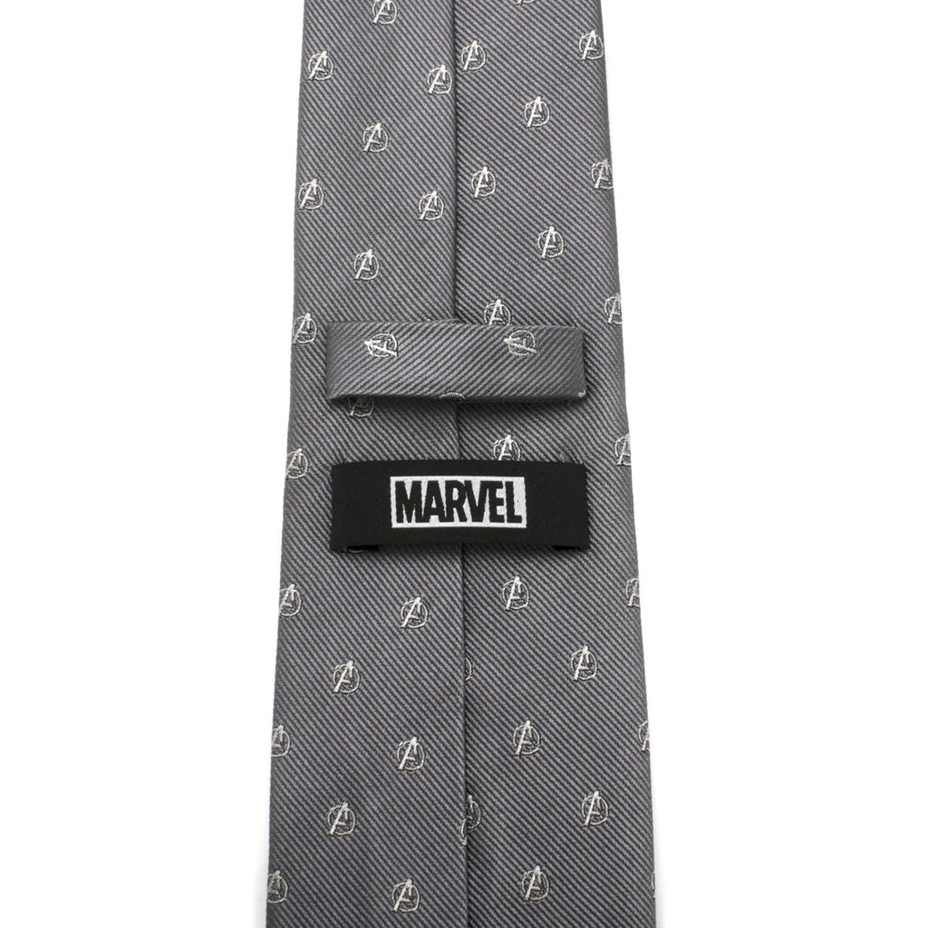 Assemble your crew's best wardrobe with this classic 100% silk gray tie. The Avenger's emblem appears scattered throughout, picked out in fine silver thread, and the Marvel Comics logo can be found on the reverse. Officially licensed by Marvel.