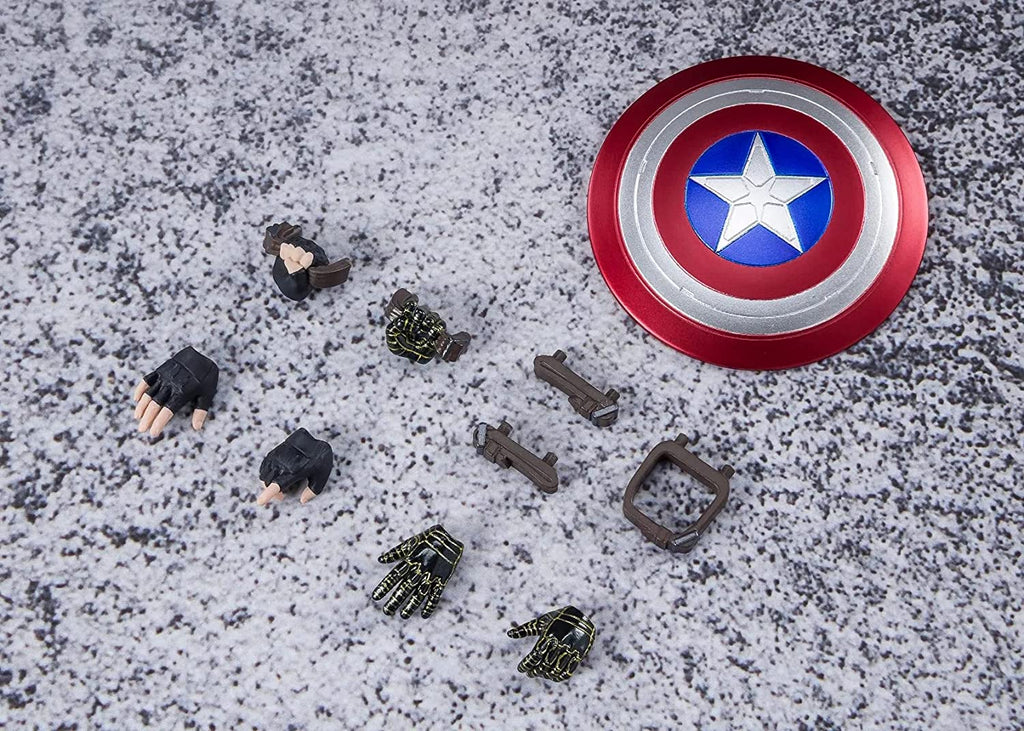 The Falcon and the Winter Soldier Bucky Barnes S.H.Figuarts Action Figure includes 3x pairs of optional hands, optional head (side glance), option parts set, and custom stand set. Measures about 5 9/10-inches tall.