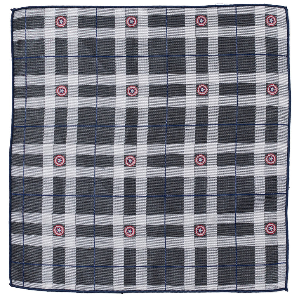 Inspire your colleagues to achieve great things with this our Captain America Gray Plaid Pocket Square, featuring Captain America shield icons woven in a gray and blue plaid design. Imbued with the power of superhero craftsmanship, our 100% Silk pocket square is built to withstand the mightiest battles while making sure you'll always maintain your sharp, heroic look. Wear alone or pair with our matching Captain America Gray Plaid Tie. Officially licensed by Marvel.