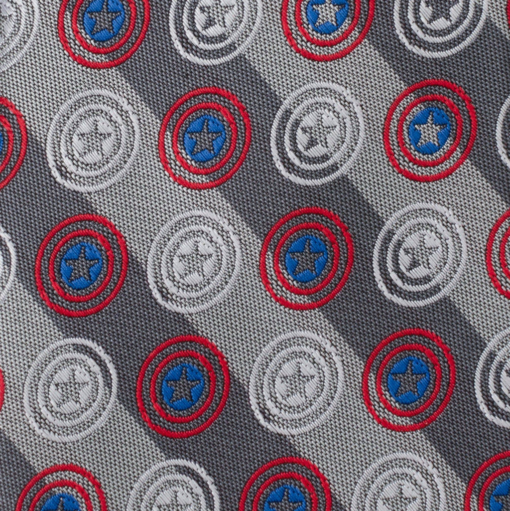 Defend your sense of style with our Captain America Gray Stripe Men's Tie! This tie is designed with slate gray and silver diagonal stripes to compliment and enhance Captain America's Shield; woven in both full color and white. Imbued with the power of superhero craftsmanship, our Silk Blend tie is built to withstand the mightiest battles while making sure you'll always maintain your sharp, heroic look. Officially licensed by Marvel.