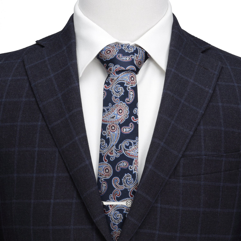 A scattered paisley design in shades of red, black, and blue appears on this 100% silk navy tie. Look closely and you'll spot Captain America's shield logo subtly nestled in the center of each paisley, making this tie a guaranteed hit for the more discrete Captain America fan. Officially licensed by Marvel.
