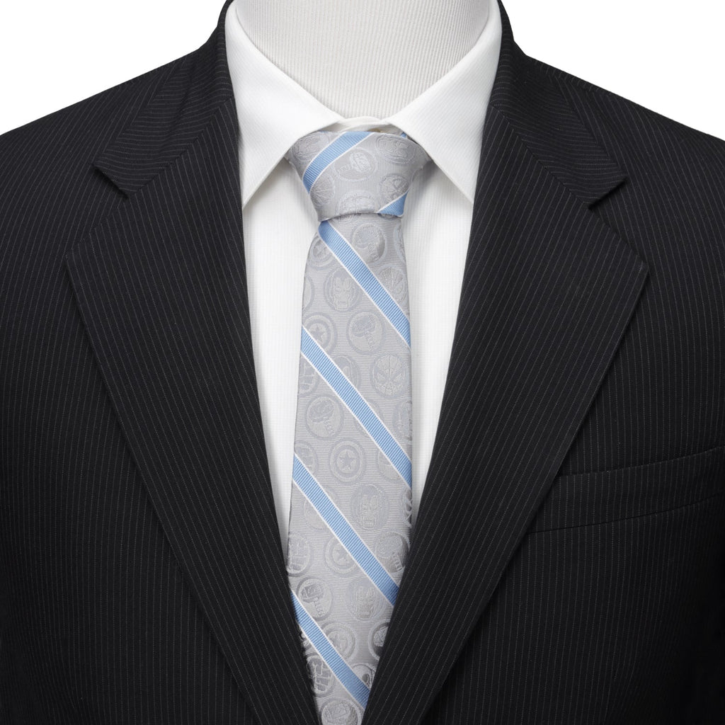 Classic colors meet modern design in our Marvel Comics Gray and Blue Stripe Tie. Nestled between diagonal stripes of pale blue you'll find gray icon motifs of Marvel's most beloved characters such as Iron Man, Thor, Hulk, Spider-Man, and Captain America. Our tie will maintain its shape and hold a perfect knot thanks to the durable yet soft 100% Silk. Officially licensed by Marvel.